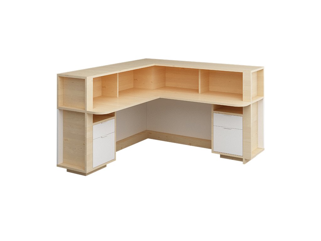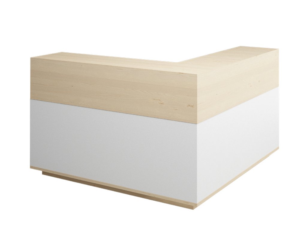 - Recepční pult o rozměrech 183,5 x 183,5 x 119 cm vyroben z dřevotřísky tloušťky 25 mm, dekor bříza a bílá barva