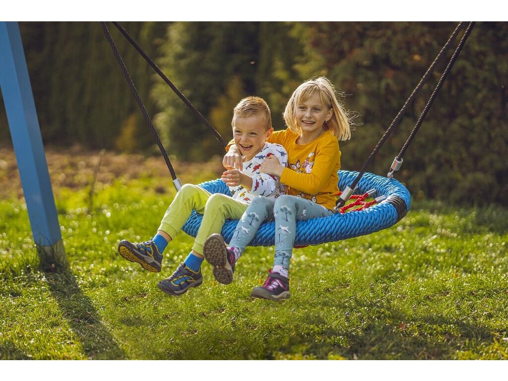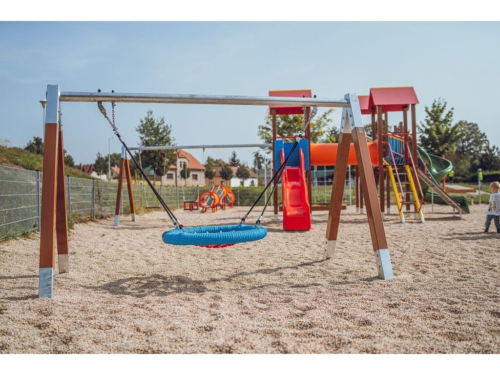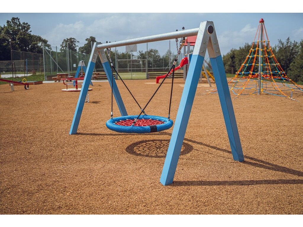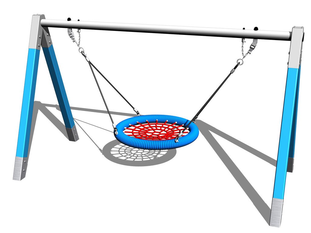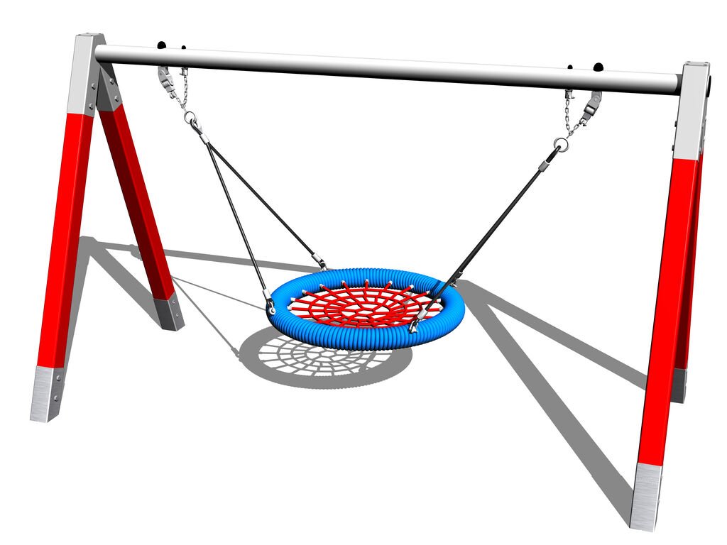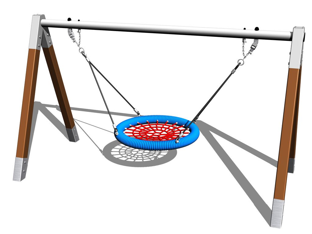 Řetězová houpačka RH170K - celokovová, průměr hnízda 1 m, výška pádu 1 m, jako dopadová plocha postačí trávník. Na výběr jsou tři barevné varianty konstrukce - hnědá, modrá a červená.