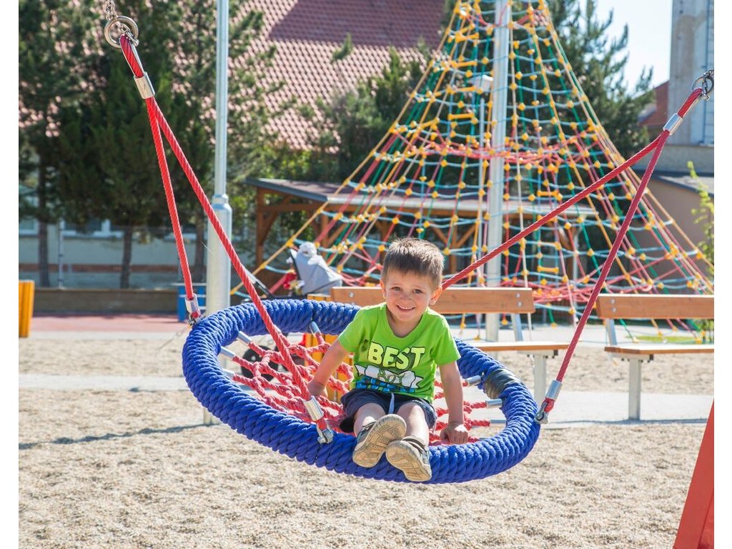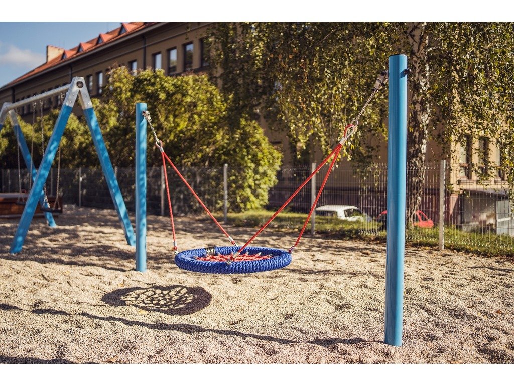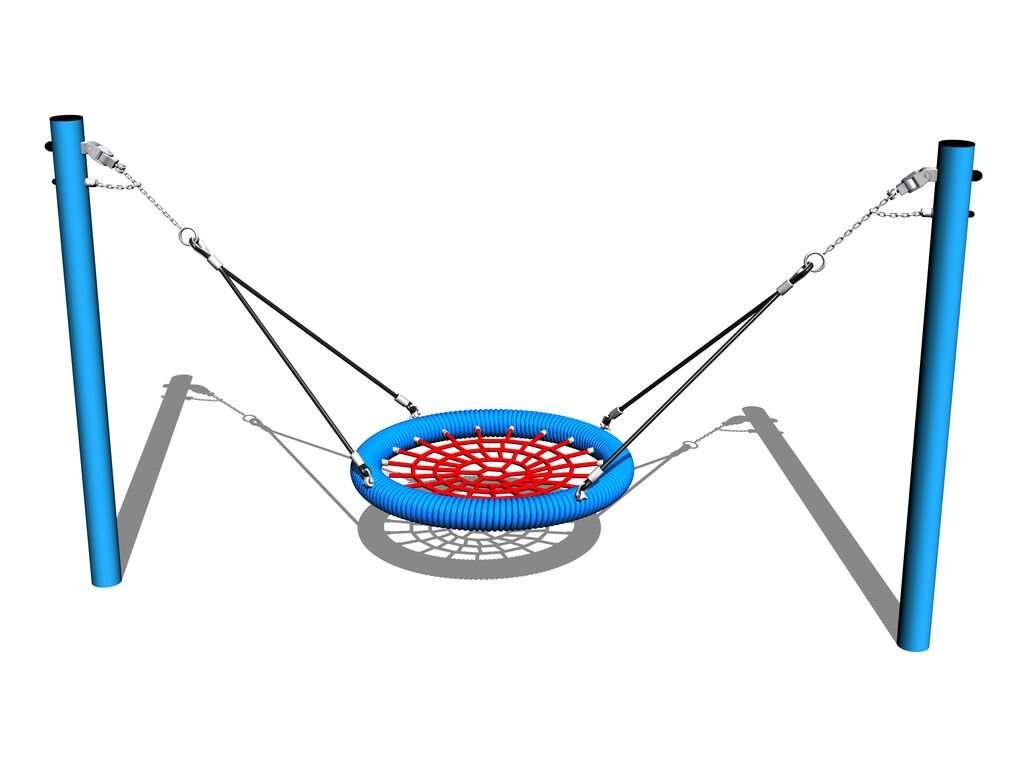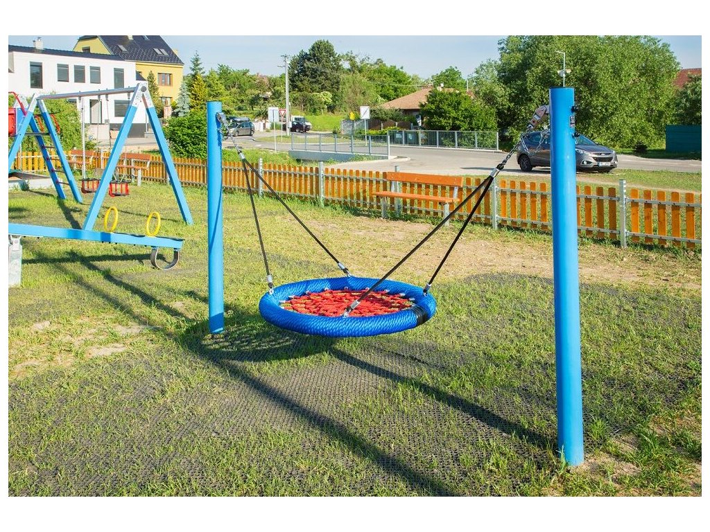Řetězová houpačka RH160K - celokovová, průměr hnízda 1 m, výška pádu 1 m, jako dopadová plocha postačí trávník. Na výběr jsou tři barevné varianty konstrukce - hnědá, modrá a červená.