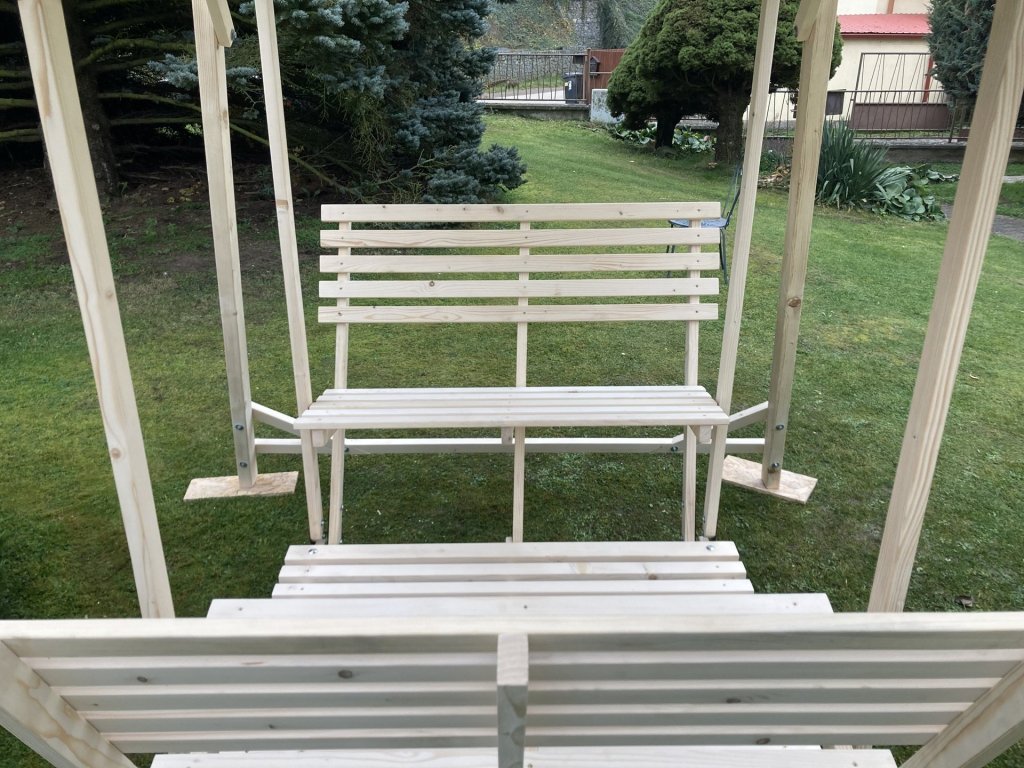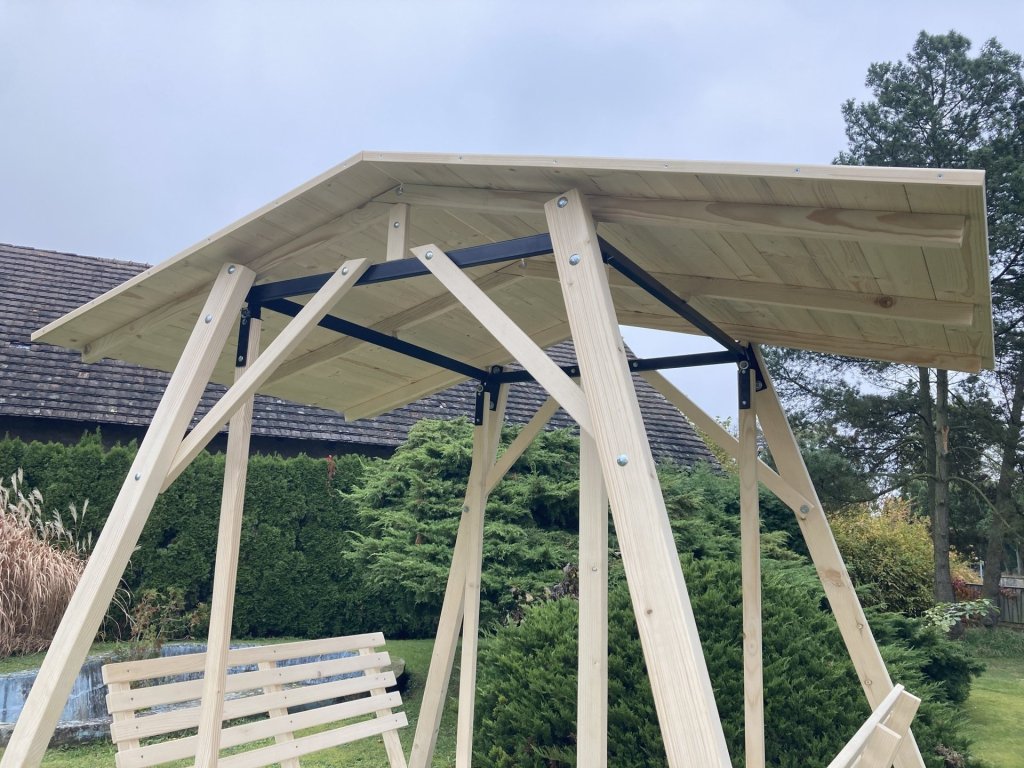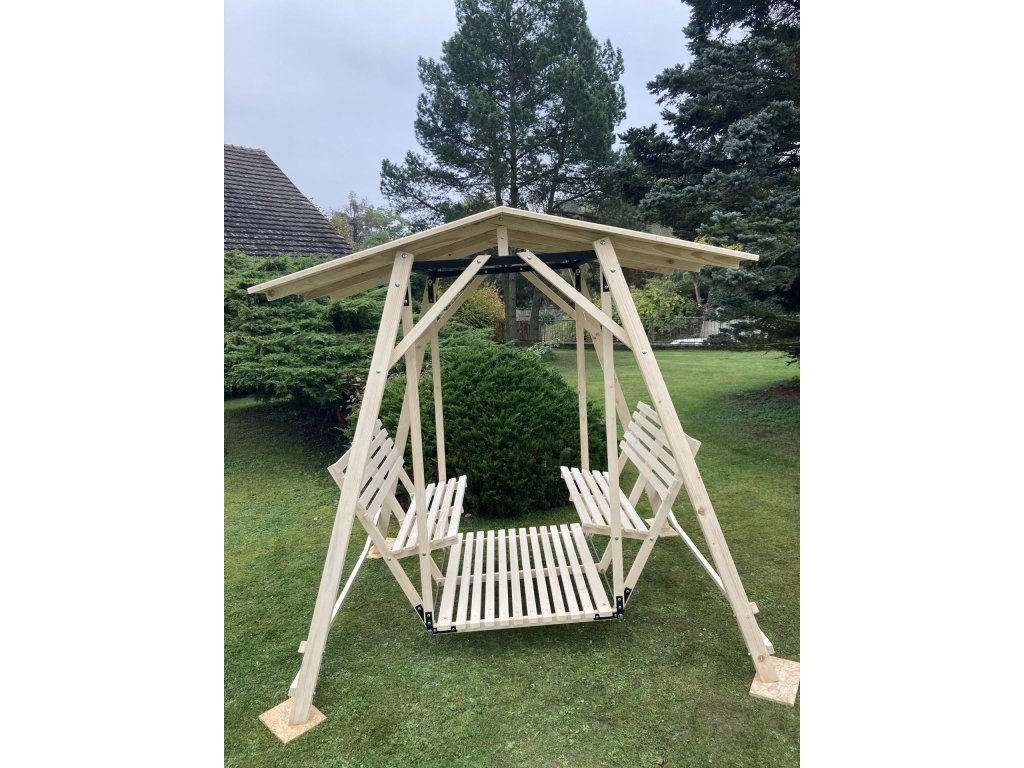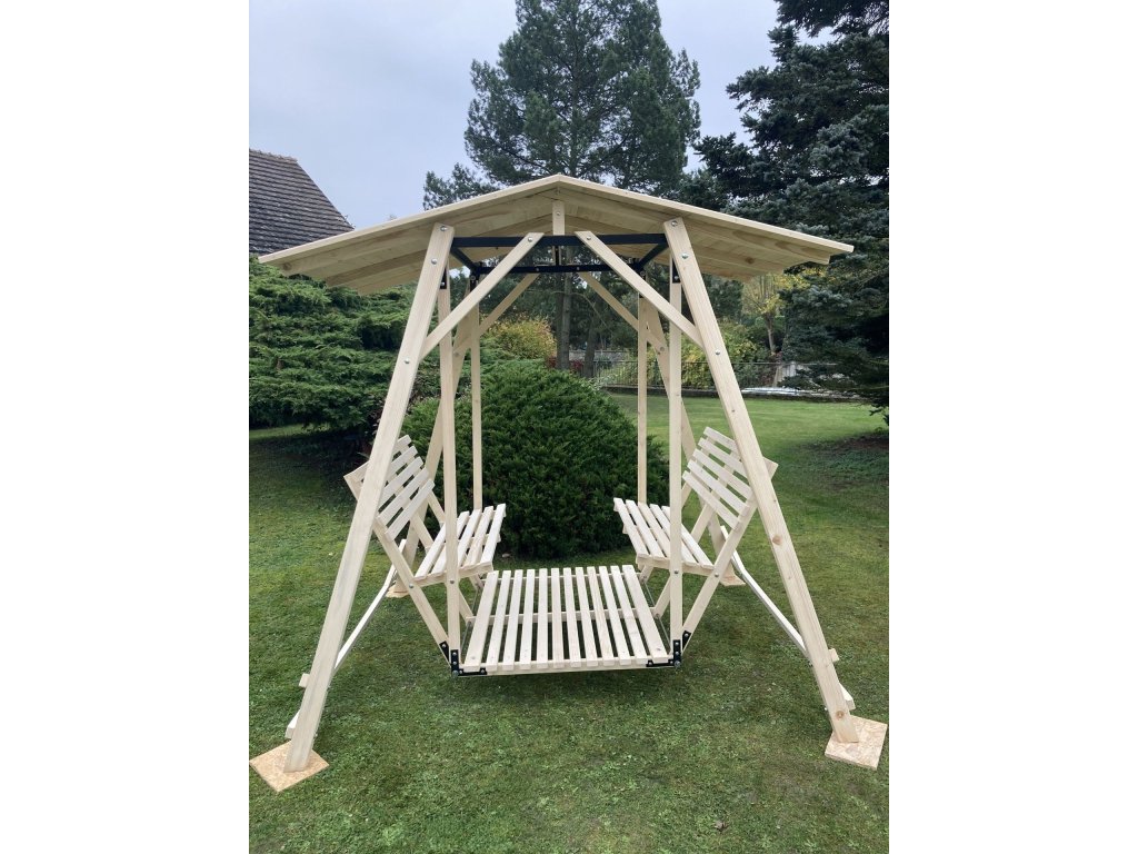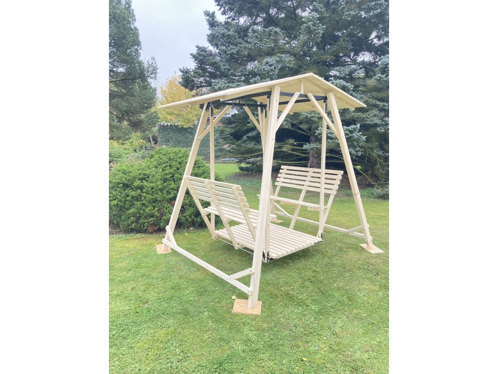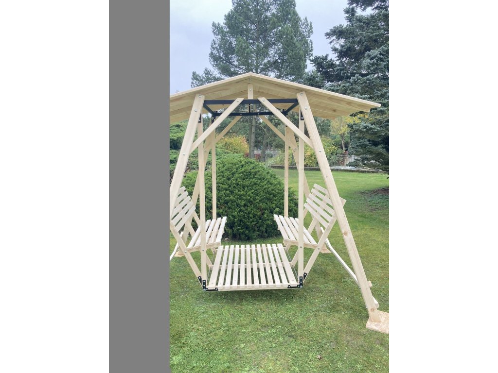 Retro zahradní houpačka s lazurou a střechou z bobrovky