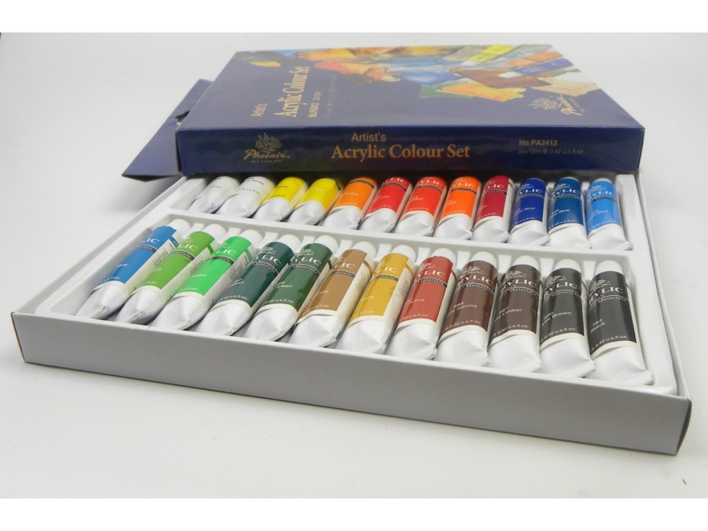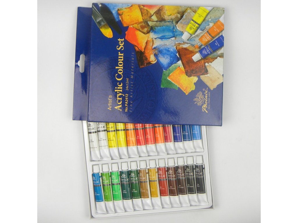 Klasická sada akrylových barev pro začátečníky, studenty i pokročilé umělce. Akrylové barvy značky Phoenix zastupují barvy přijatelné kvality za velice výhodné ceny, doporučujeme proto všem, kteří hledají rozumný poměr kvalita/cena. Díky velkému procentu obsažených pigmentů mají výrazné odstíny a jemnou konzistenci. Mísit je můžete jak mezi sebou, tak i s ostatními akrylovými barvami a mnohými médii, po zaschnutí dostávají příjemný lehce saténový nádech.