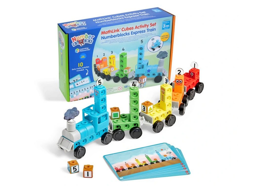 Learning Resources – Express Train Activity Set je interaktivní vzdělávací sada, která kombinuje oblíbené postavy z Numberblocks s kreativní konstrukcí a základními matematickými aktivitami. Děti si staví postavičky čísel 1 až 5 pomocí 21 spojovacích kostek, doplní je o Numberlings figurky, a pomocí kolejových dílků sestaví vlastní vlak. K tomu využívají nákladní díly a aktivity, které vedou děti hravou formou k počítání, sčítání, odčítání a porozumění číslu.