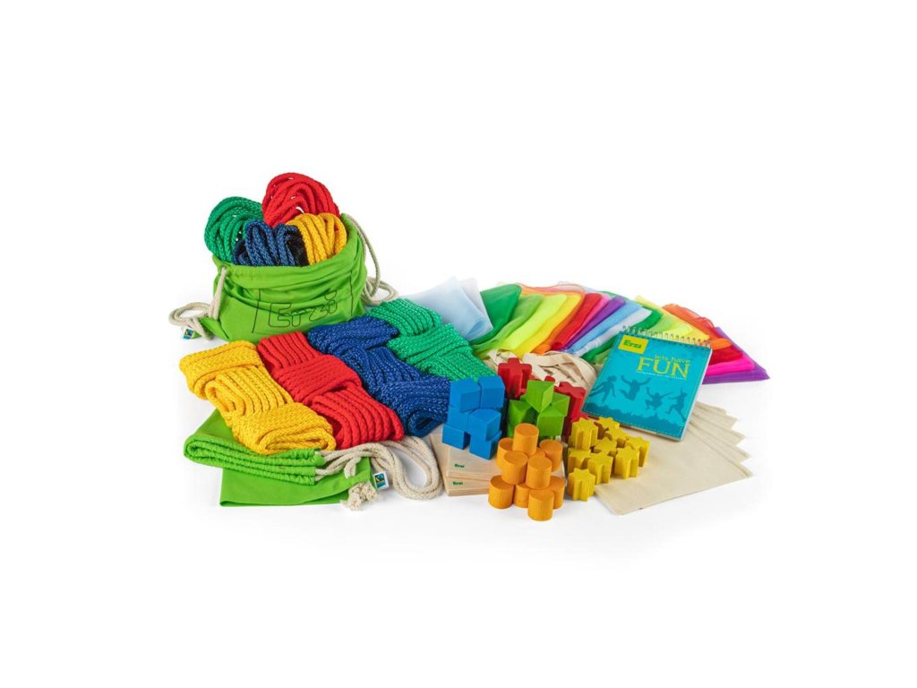 Obsah: 2 batůžky, 12 lan á 3m (4ks od barvy), 4 lana á 12m, 2 prkýnka, 50 stavebnicových kostek, 20 šátků, 5 sáčků, návod.