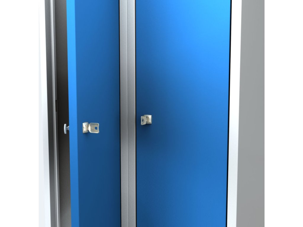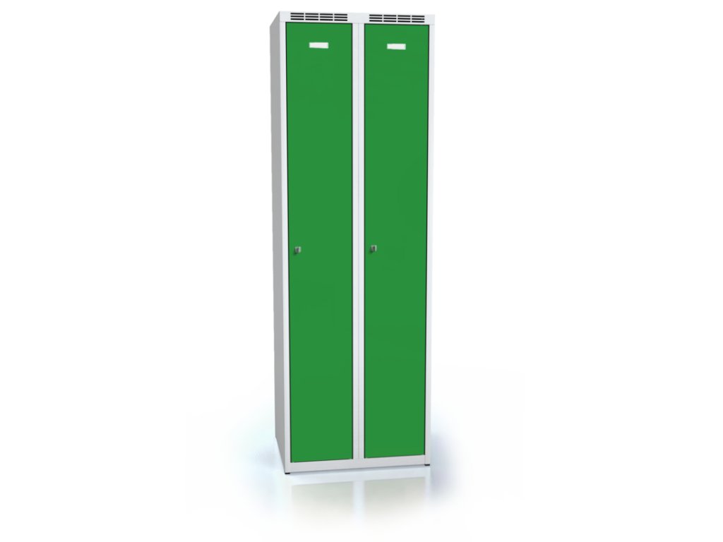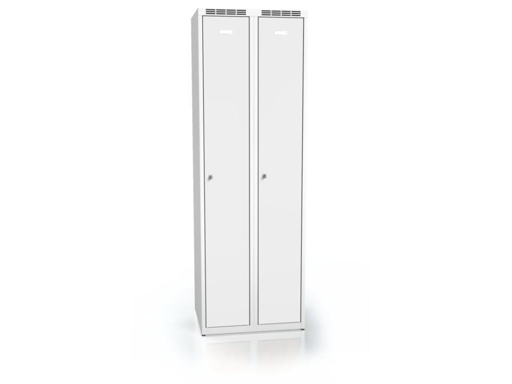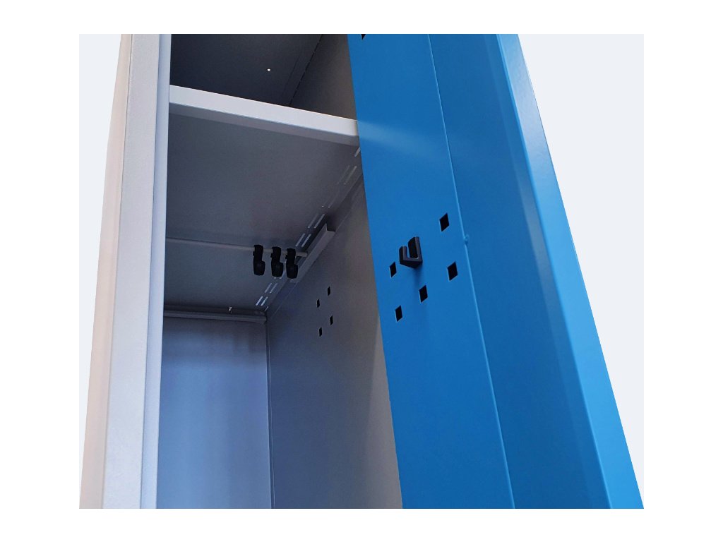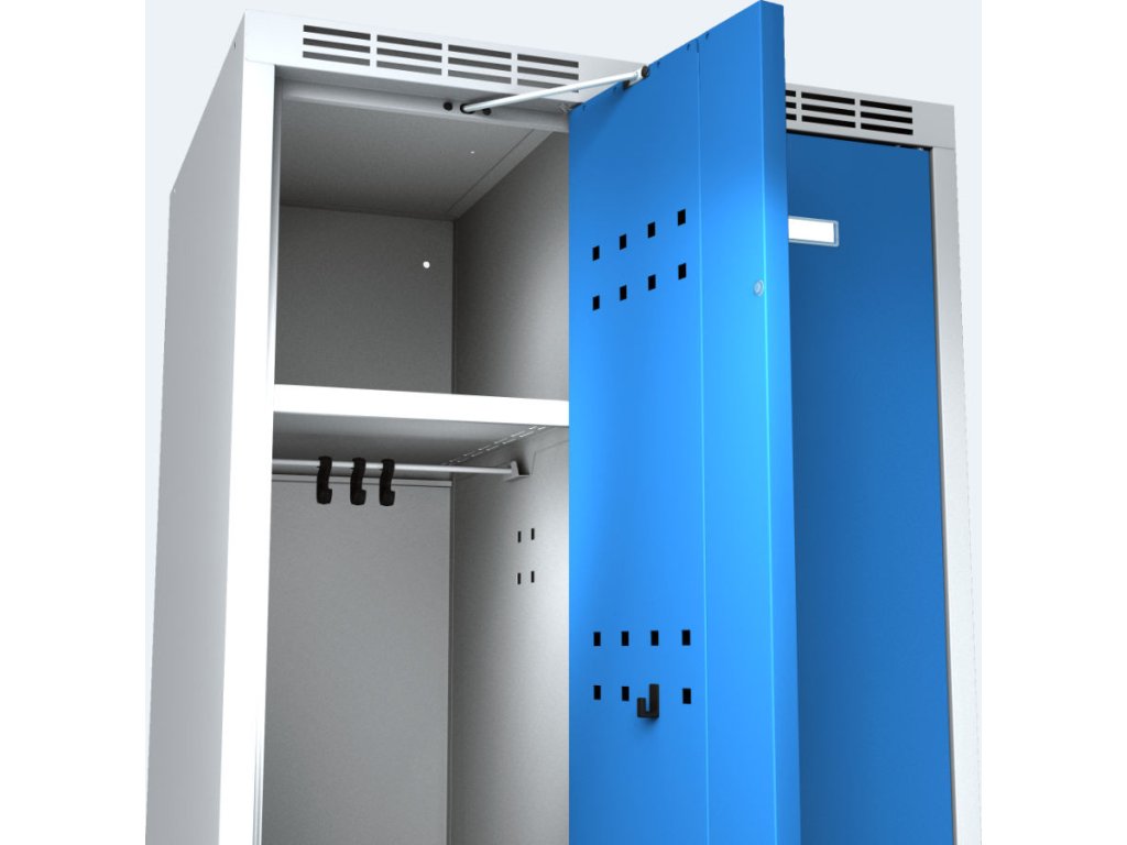 Skříň šatní s dvouplášťovými dveřmi, sokl v = 40 mm, šíře oddělení 300 mm, počet oddělení - 2, počet dveří v oddělení - 1, v odd. 270 mm od víka police, na spodní straně police tyč se třemi plast. háčky.