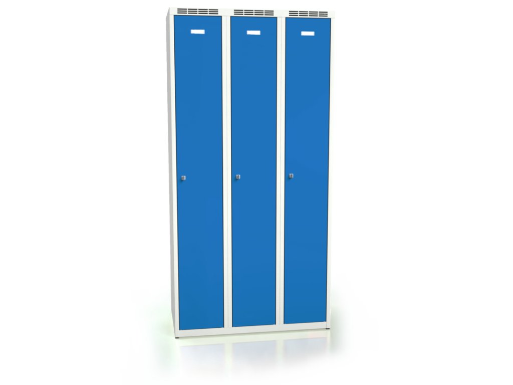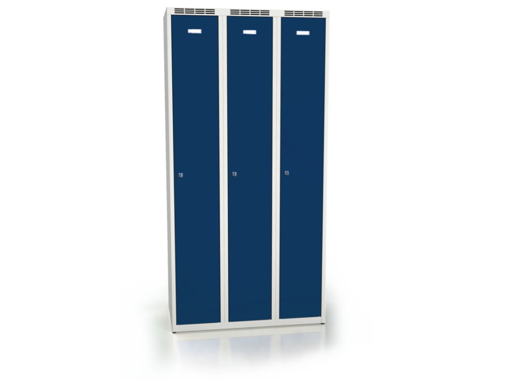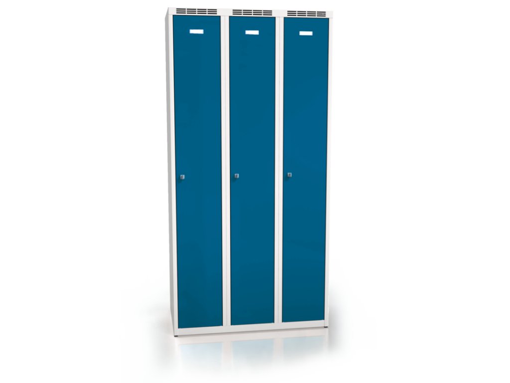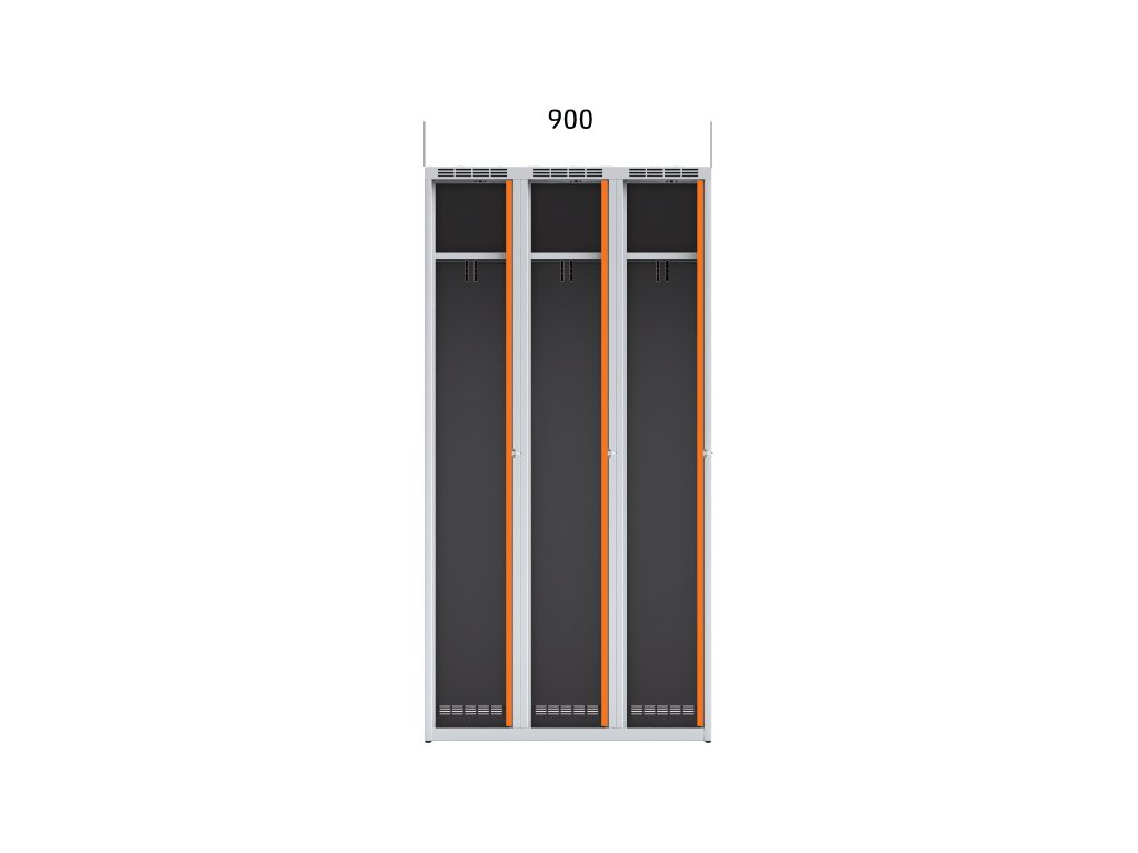 Skříň šatní s jednoplášťovými dveřmi, sokl v = 40 mm, šíře oddělení 300 mm, počet oddělení - 3, počet dveří v oddělení - 1, v odd. 270 mm od víka police, na spodní straně police tyč se třemi plast. háčky.