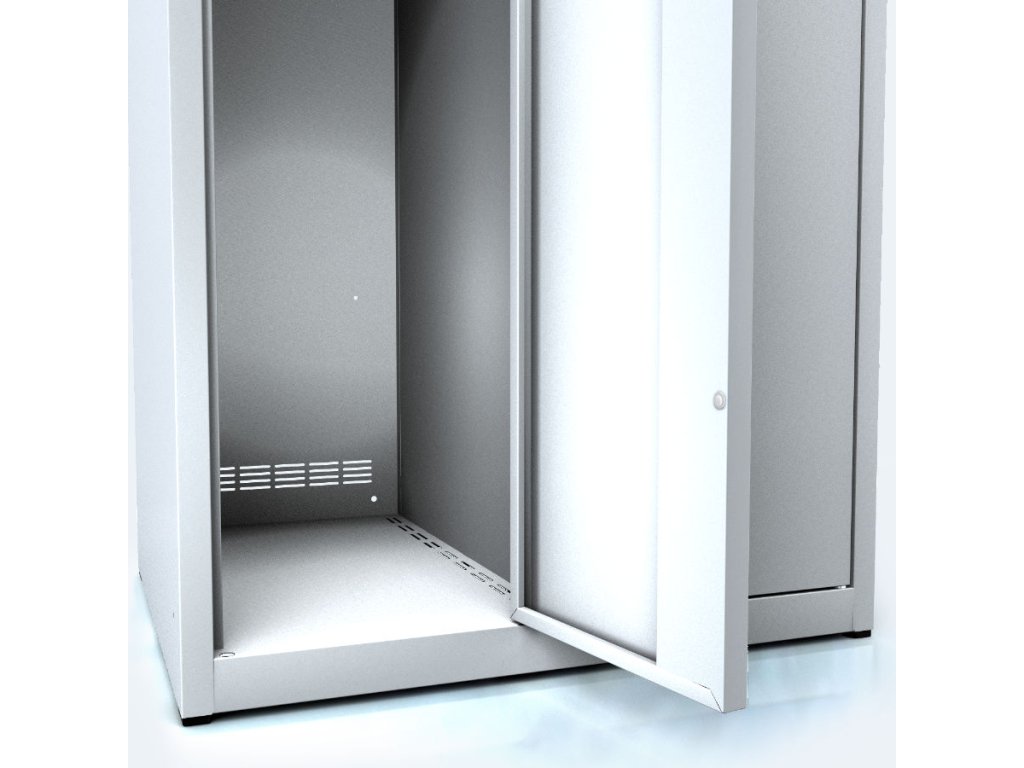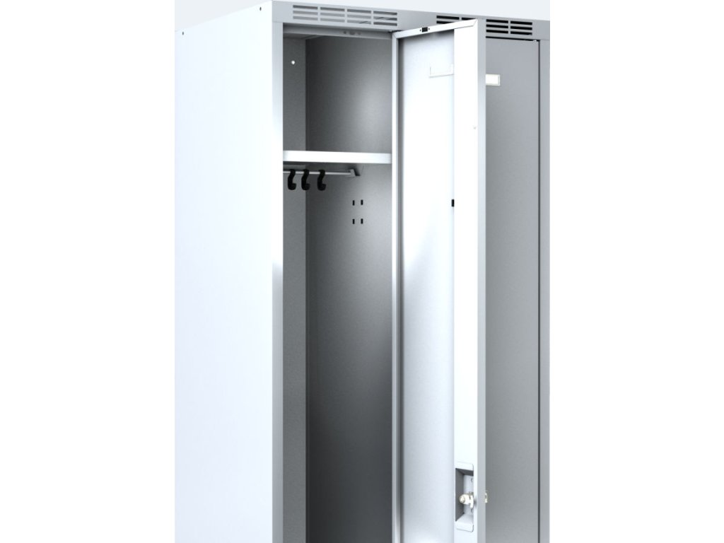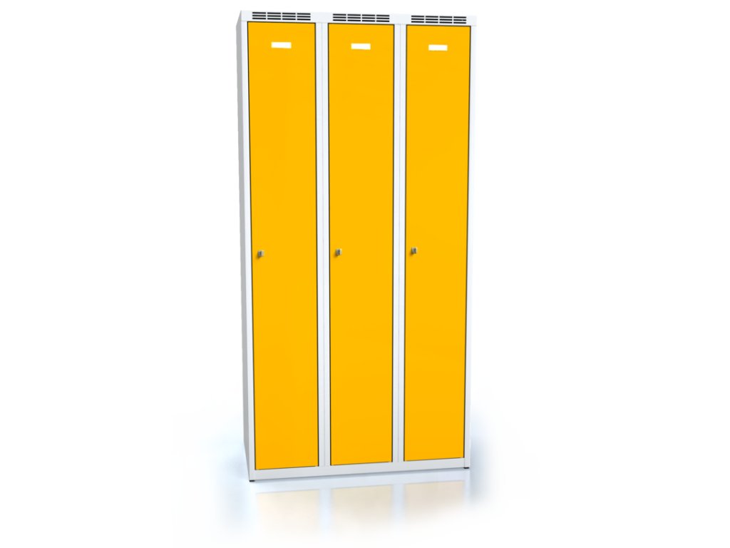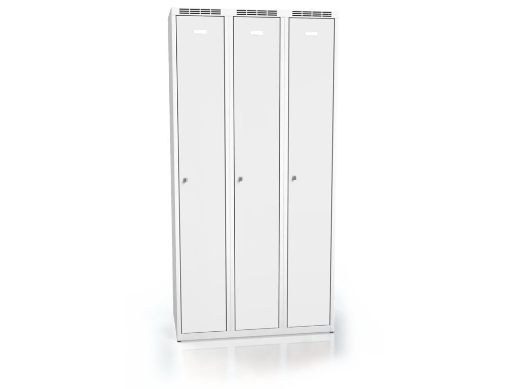 Skříň šatní s jednoplášťovými dveřmi, sokl v = 40 mm, šíře oddělení 300 mm, počet oddělení - 3, počet dveří v oddělení - 1, v odd. 270 mm od víka police, na spodní straně police tyč se třemi plast. háčky.