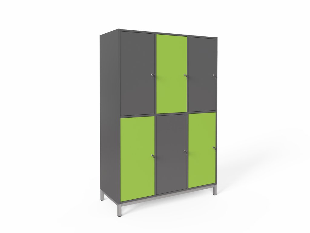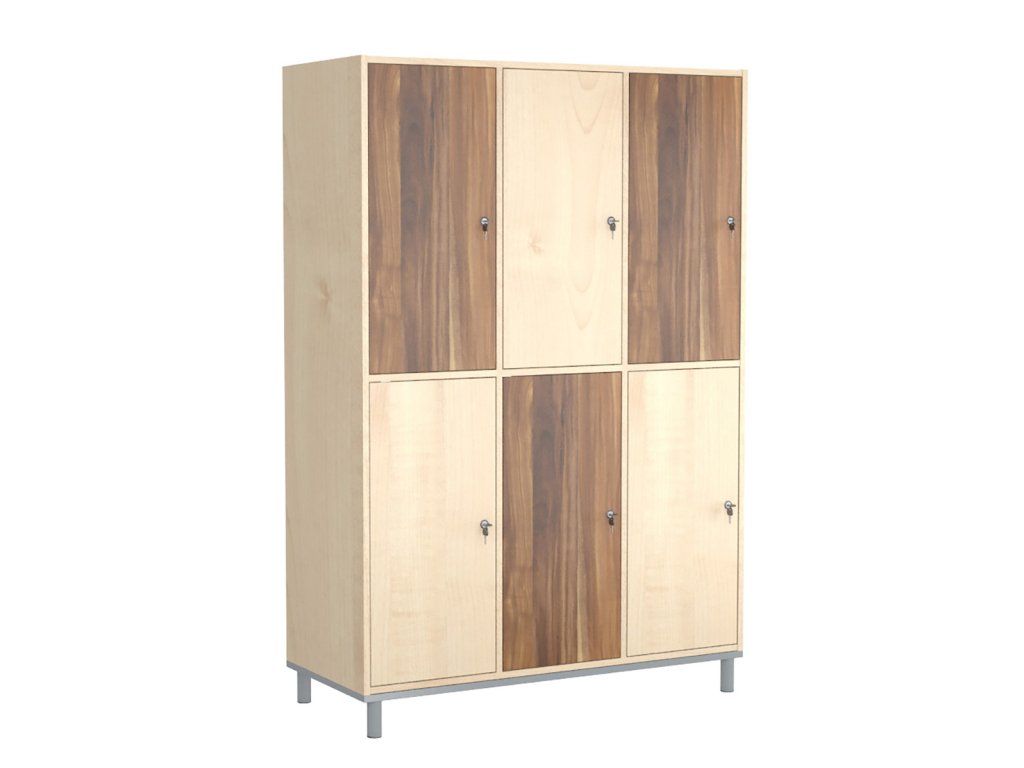 Praktické a cenově dostupné šatní skříňky z laminované dřevotřísky s dělenými dvířky, ideální, pokud máte v šatně (tělocvičny, bazénu nebo šatně pro zaměstnance) málo místa.