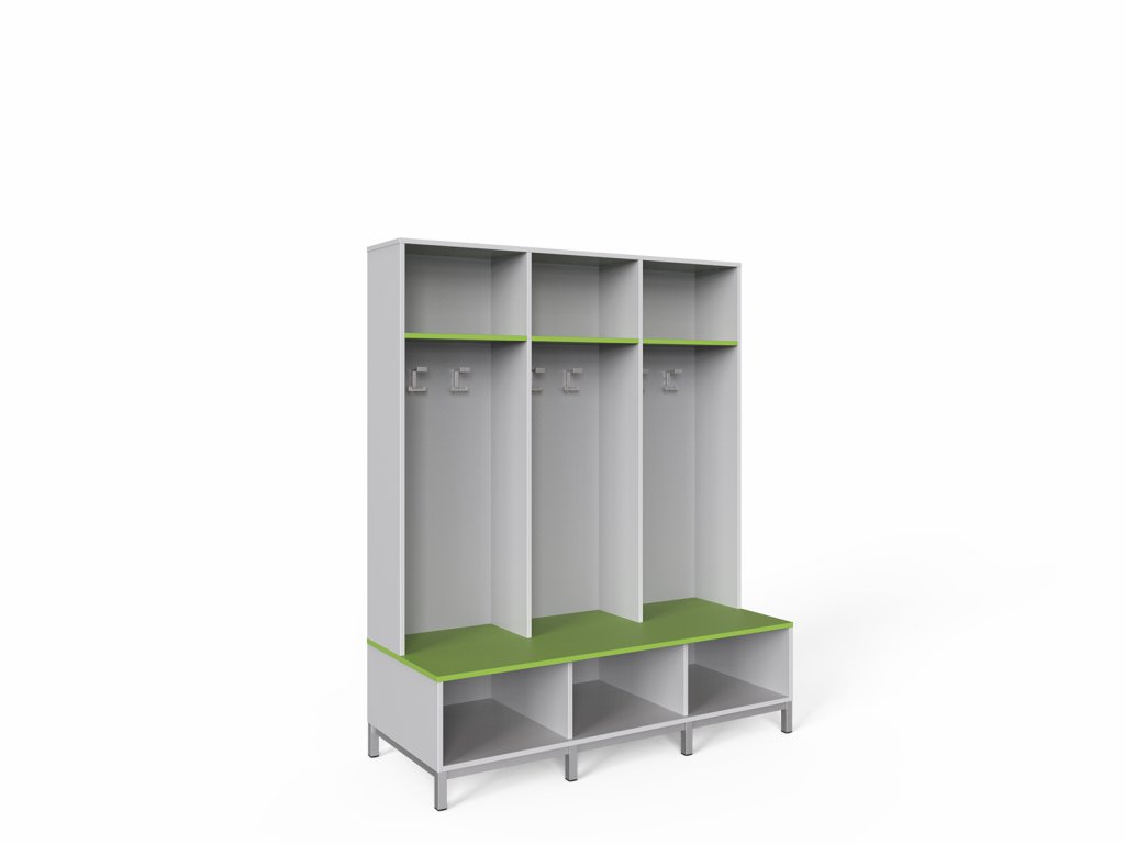 Sportovní skříňka z laminované dřevotřísky s ABS hranou, vestavěná lavička a odkládací police na boty, v každém oddílu 2 háčky, odkládací police. Podnož a nohy jsou z ocelového profilu 30x30 mm, opatřeného elektrostaticky nanášenou práškovou barvou, nastavitelné koncovky noh.
