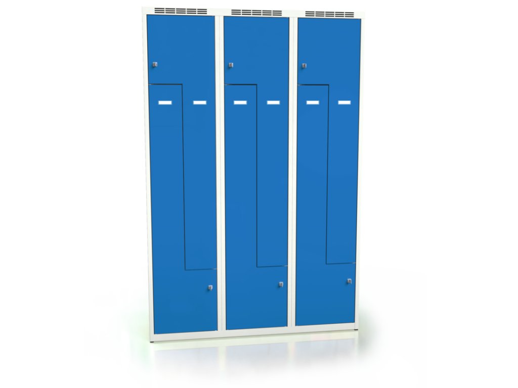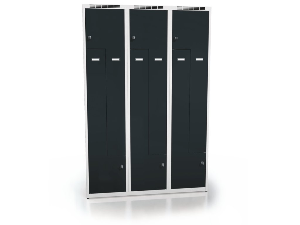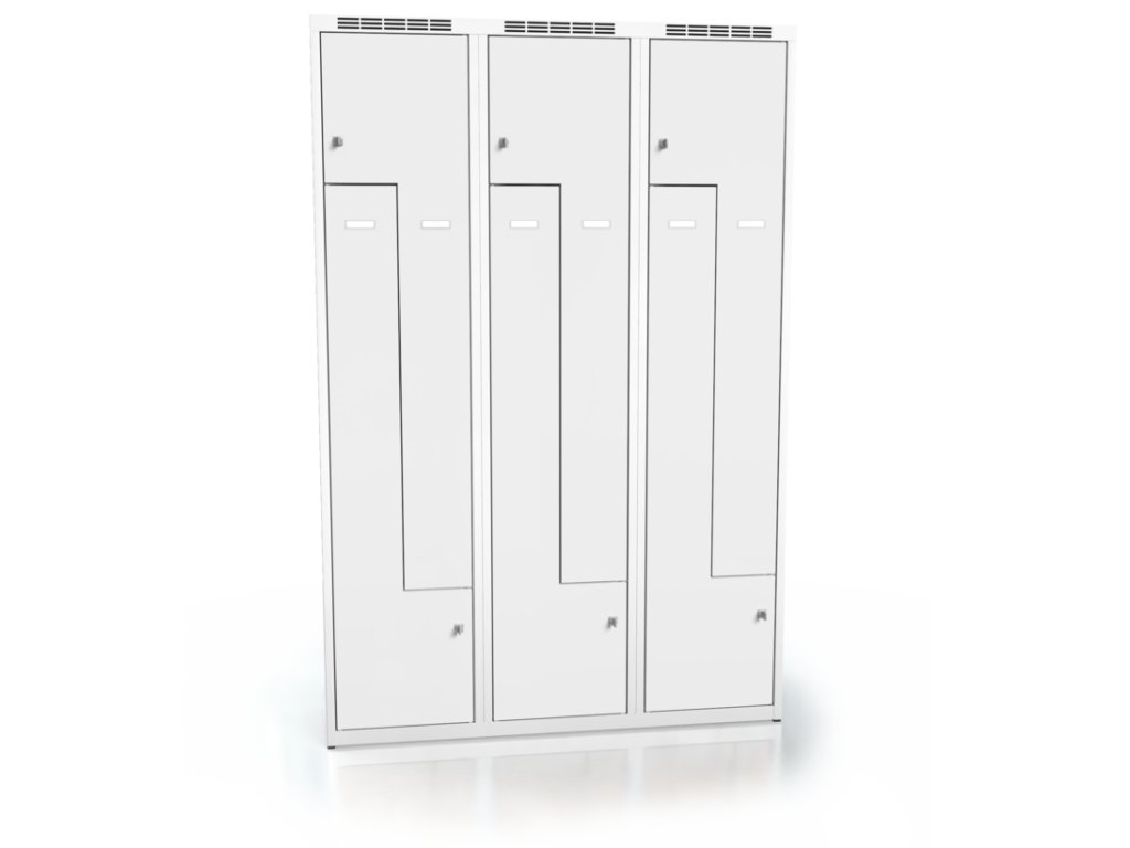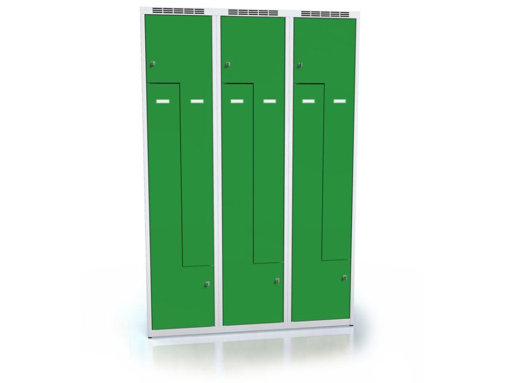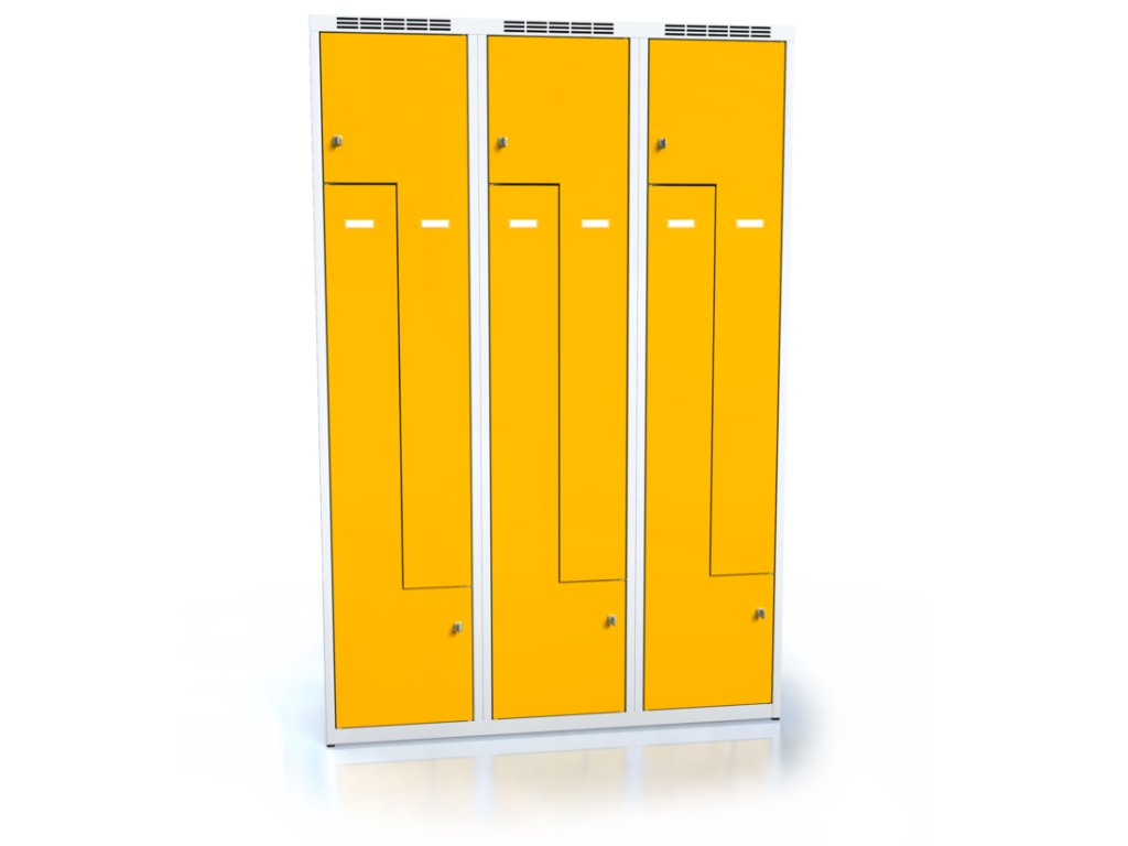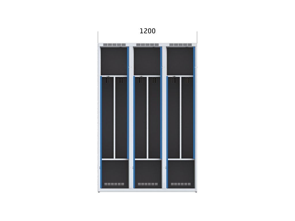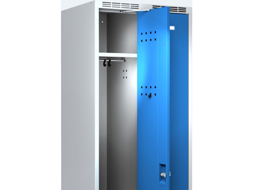 Skříň šatní s dvouplášťovými dveřmi provedení Z, sokl v = 40 mm, šíře oddělení 400 mm, počet oddělení - 2, počet dveří v oddělení - 2, v odd. 270 mm od víka police, na spodní straně police tyč s plast. háčky.