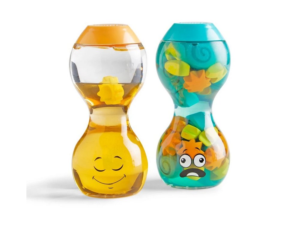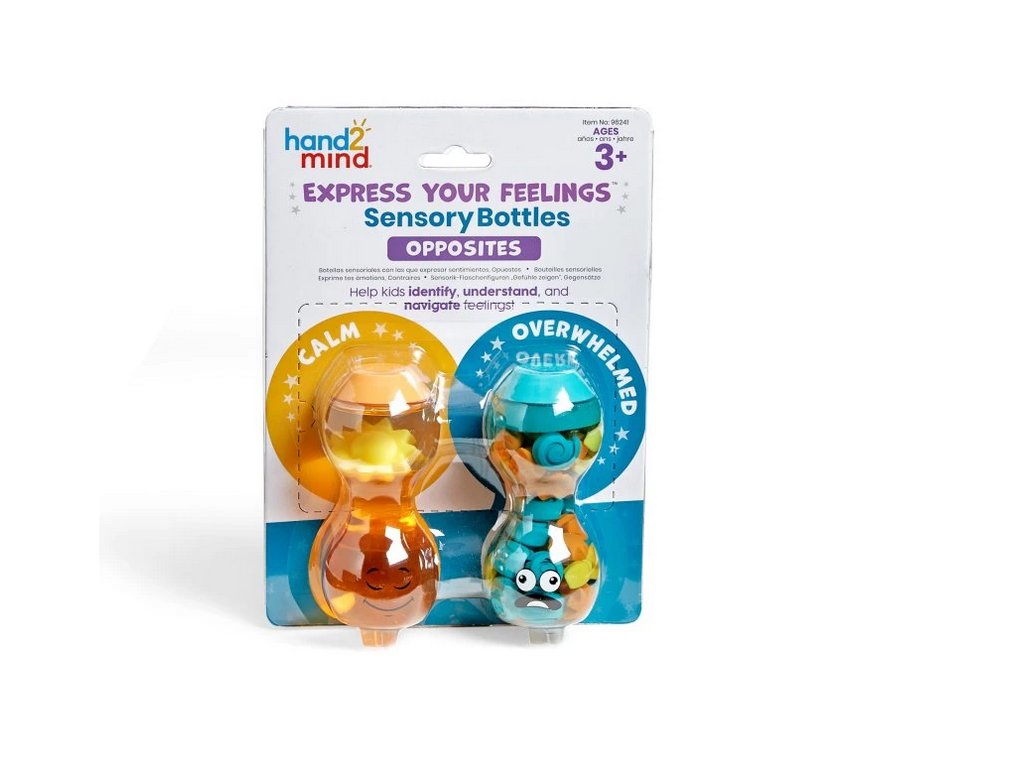 Tato senzorická sada značky Hand2Mind nabízí dětem možnost porozumět protichůdným emocím formou hry. Lahvičky naplněné barevnou kapalinou se pohybují a víří způsobem, který vyjadřuje rozdíl mezi emocemi jako je např. klid a vzrušení, radost a smutek nebo uvolnění a napětí.
