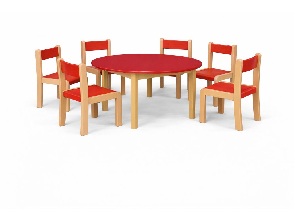 Sestava MAJA - barevná deska = 1 stůl kruh prům. 120 cm 6 noh + 6 židlí s kluzáky