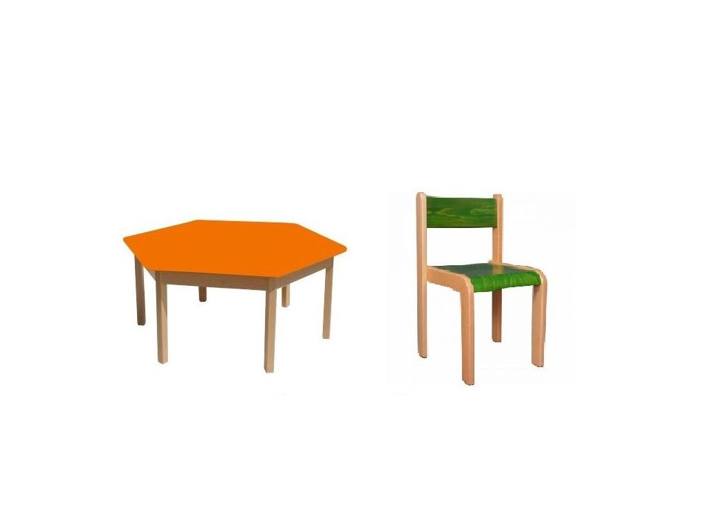 Sestava MAJA - barevná deska = 1 stůl šestiúhelník prům. 120 cm 6 nohou + 6 židlí s kluzáky