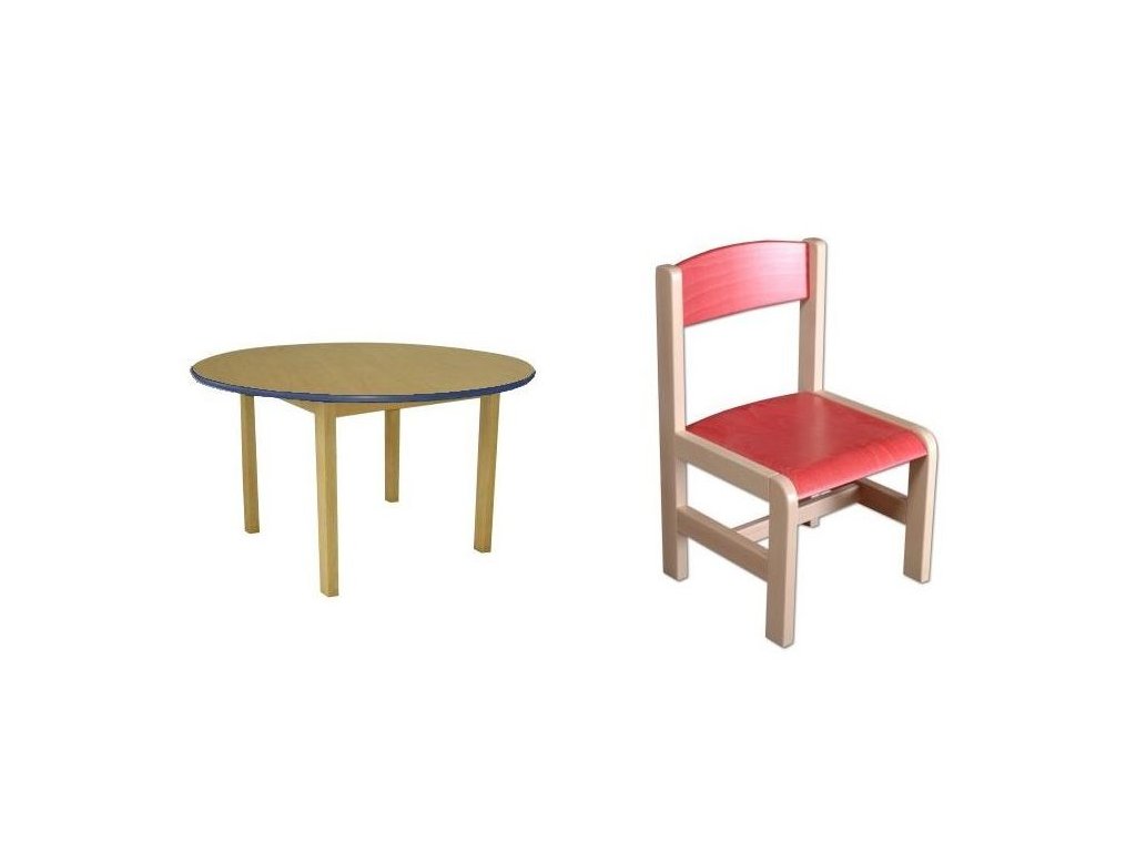 Sestava MAJA - barevná hrana = 1 stůl kruh prům. 100 cm 4 nohy + 4 židle s kluzáky