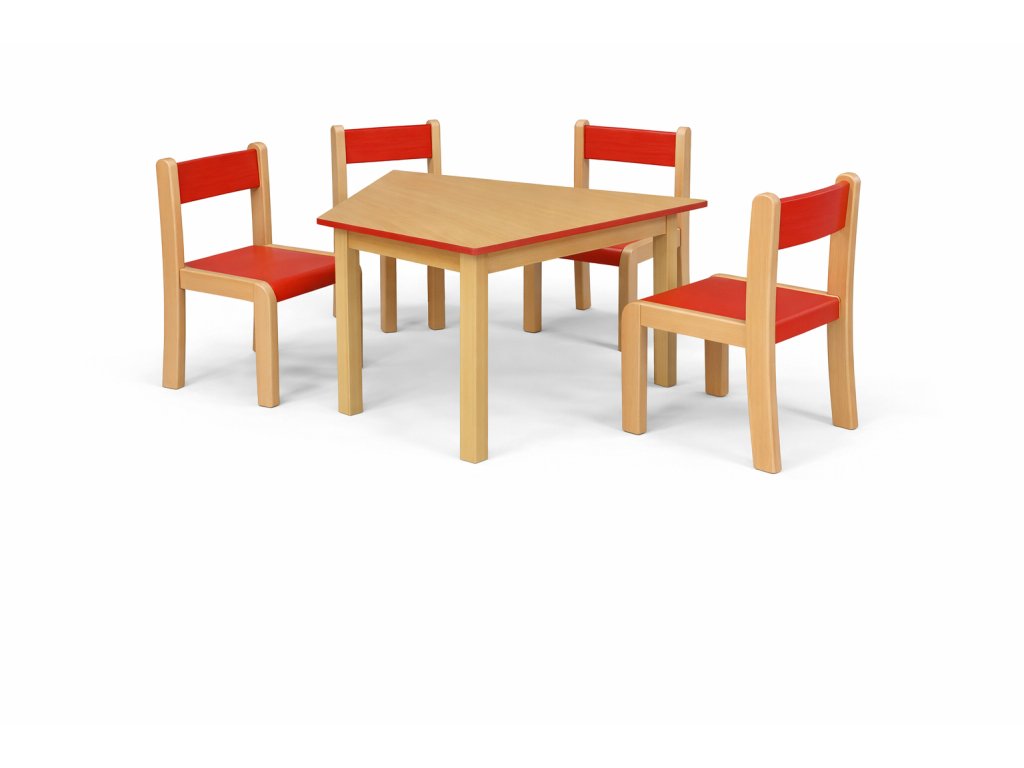Sestava MAJA - barevná hrana = 1 stůl lichoběžník 120 x 60 cm + 4 židle s kluzáky