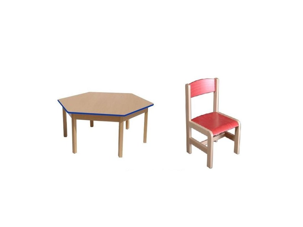 Sestava MAJA - barevná hrana = 1 stůl šestiúhelník prům. 120 cm 6 nohou + 6 židlí s kluzáky
