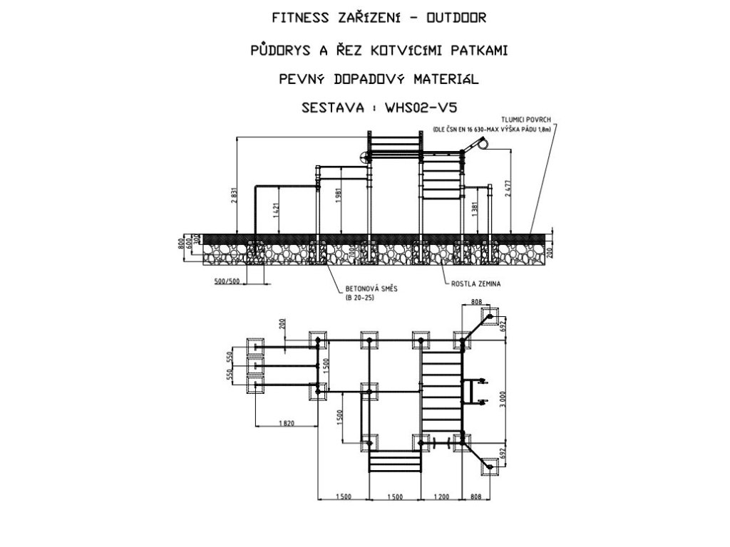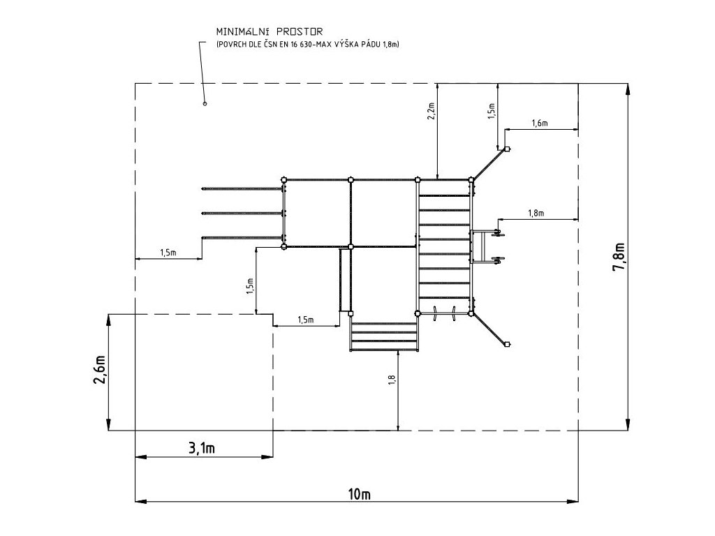 V tomto prostoru musí být vybudován povrch tlumící náraz dle výšky pádu sestavy (není součástí ceny).