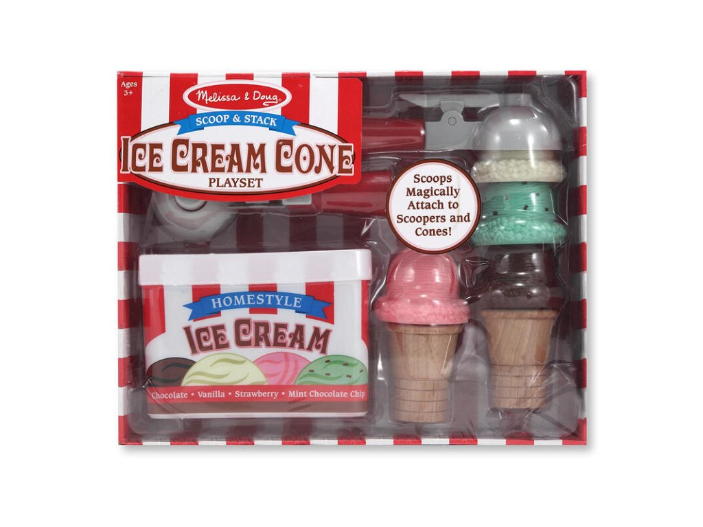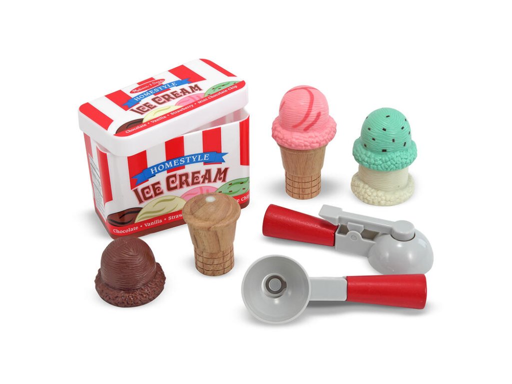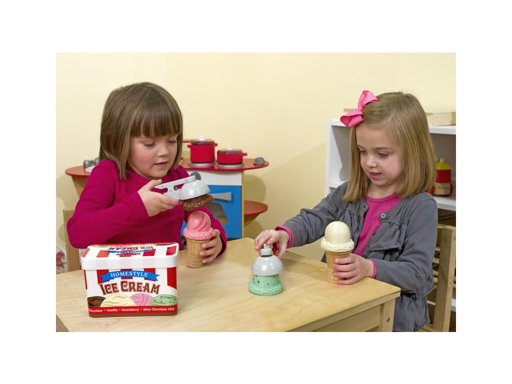 Použijte obě magnetické naběračky, čtyři kopečky oblíbených zmrzlinových příchutí a dřevěné kornouty na několik hodin „pozitivní“ sociální interakce a jemné motorické hry.
