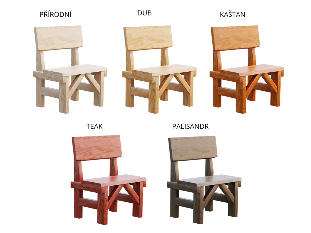 Vybrat si můžete z 5 barevných provedení výrobku. Naší nejprodávanější variantou je barva kaštan. Barva teak je podobná variantě kaštan, hnědá barva má však u teaku nádech do červena. Mimo našich 5 základních barev vám můžeme nábytek natřít také barvou dle vašeho individuálního přání. Tuto sestavu nabízíme také v přírodním provedení, fixovaný transparentním přírodním olejem. V přírodním provedení nejlépe vynikne struktura dřeva a přírodní vzhled. Všechny naše výrobky totiž moříme ještě před složením, čímž důkladně ošetřujeme také každý záhyb výrobku.