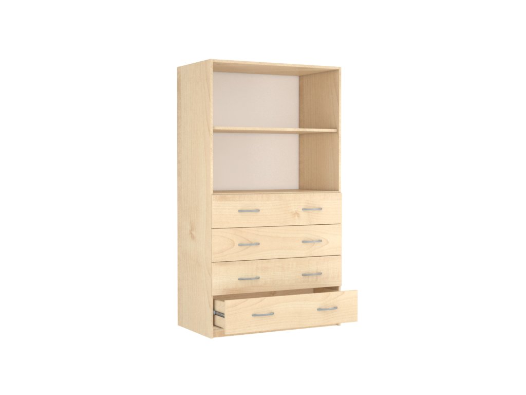 Korpus je z laminované dřevotřísky o tl. 18 mm, hrana ABS o tl. 2 mm, bílá sololitová záda o tl. 3 mm. . Dole 4 zásuvky, nahoře otevřená, 1× police.
