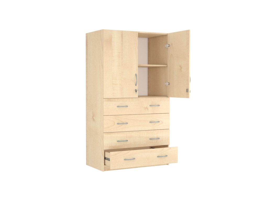 Korpus je z laminované dřevotřísky o tl. 18 mm, hrana ABS o tl. 2 mm, bílá sololitová záda o tl. 3 mm. Dole 4 zásuvky, nahoře 2× uzamykatelná dvířka, 1× police.