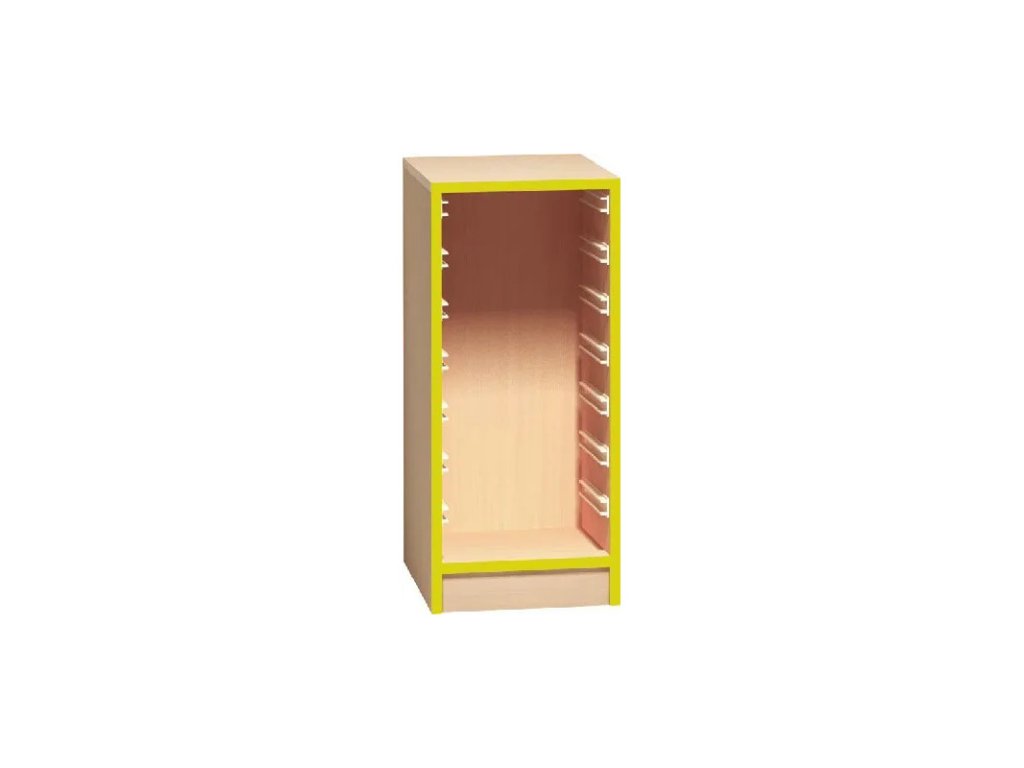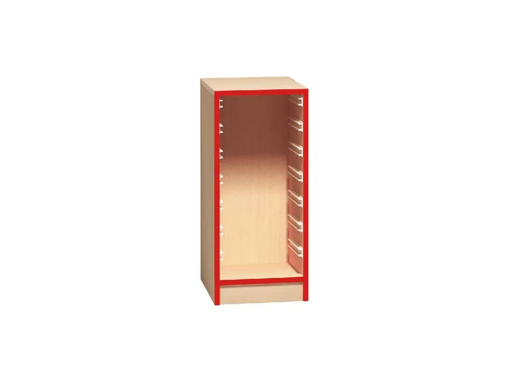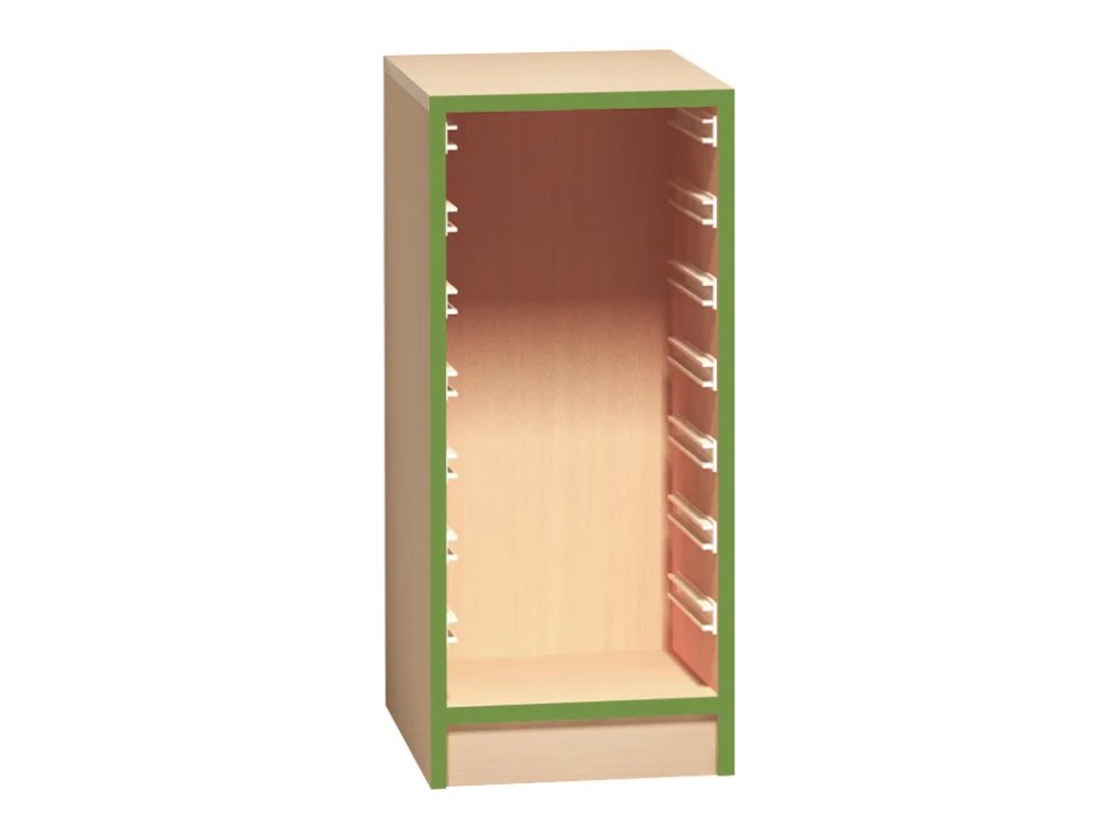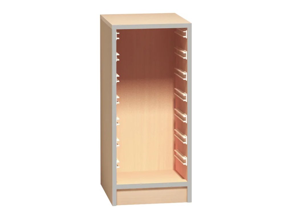 Skříňka se sedmi řadami kolejnic, do kterých je možné libovolně umístit plastové boxy.