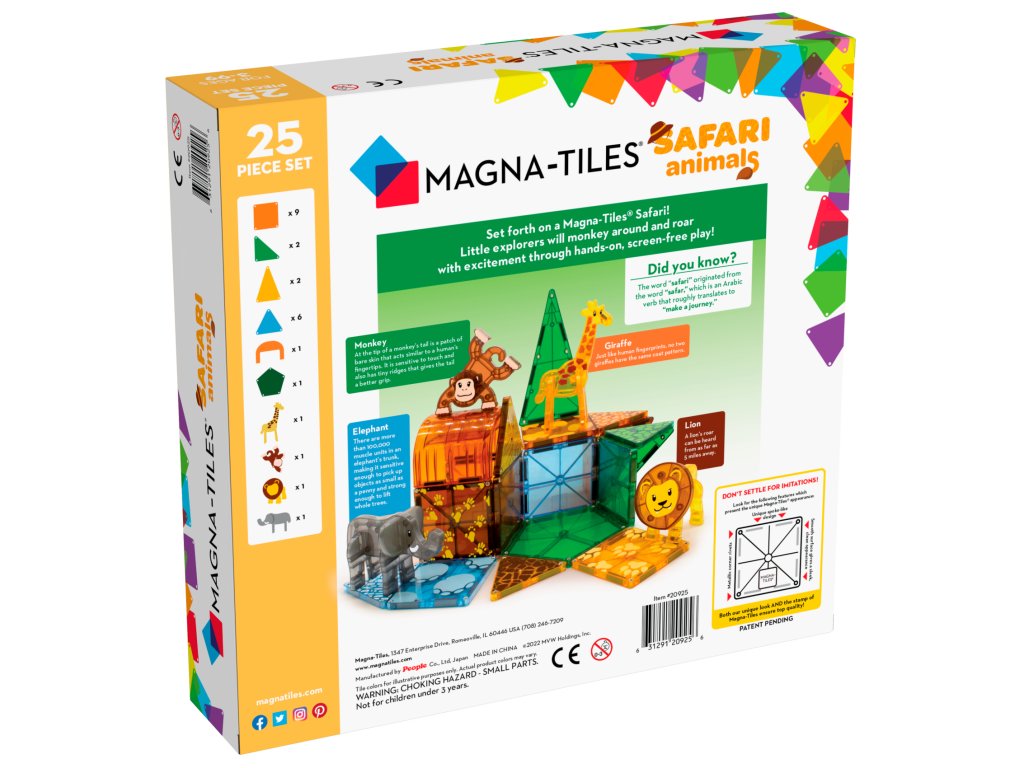 Věděli jste, že žádné dvě žirafy nemají stejný vzor srsti? 25dílná sada Magna-Tiles® Safari Animals je vytvořena pro roky hraní a obsahuje zábavná fakta o safari zvířatech přímo na krabici. Tvary a zvířata jsou vyrobena z potravinářského ABS plastu, který je z důvodu bezpečnosti bez BPA, latexu a ftalátů. Živé barvy a vzory oživují hru a silné magnety zajišťují snadné spárování každého dílu.