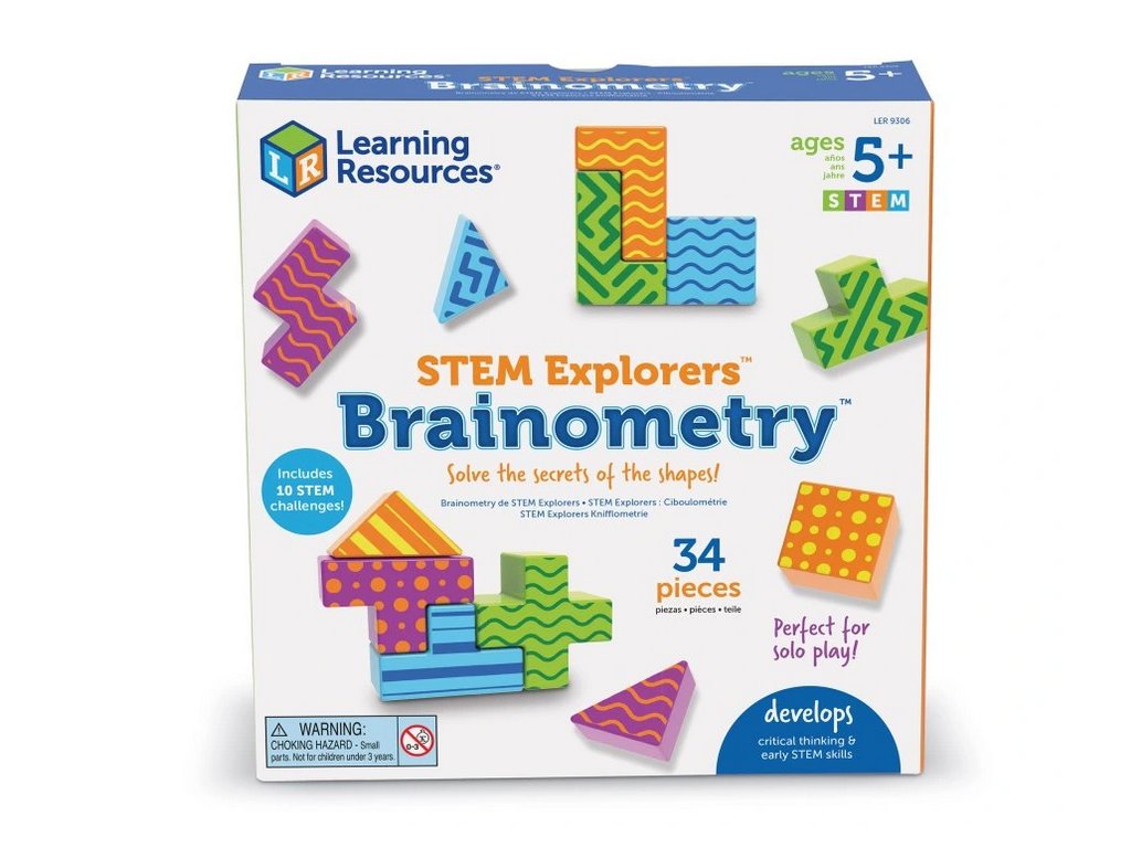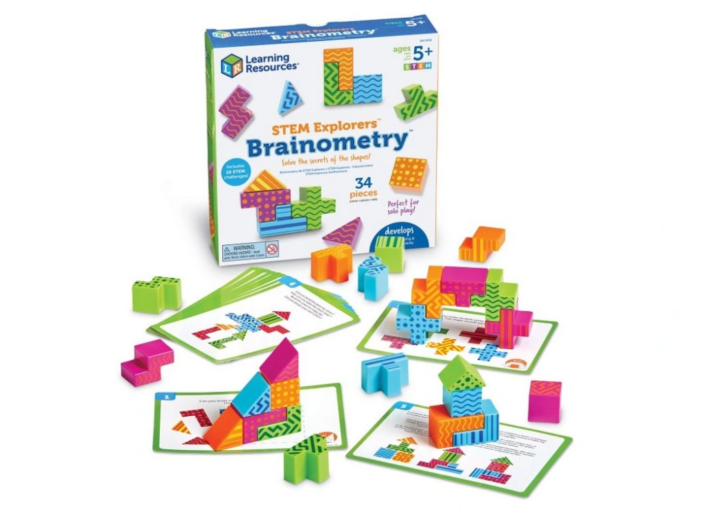 Learning Resources STEM Explorers™ Brainometrie™ je originální logická hra, která dětem nabízí více než 30 různých výzev v podobě 3D skládání. Barevné dílky je potřeba sestavit podle zadání na kartách, a tím děti procvičují prostorovou představivost, logické uvažování a schopnost řešit problémy krok za krokem.