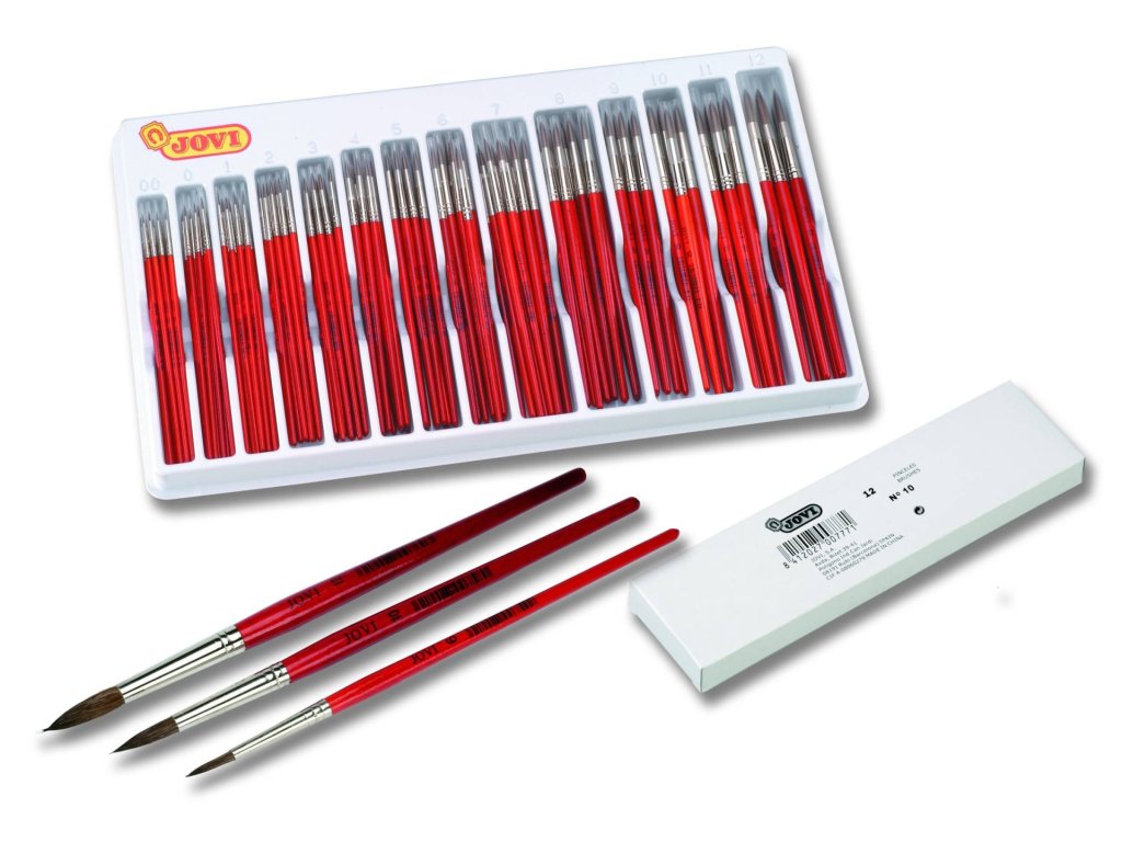 Souprava školních kulatých štětců Jovi pro malování vodou ředitelnými barvami a pro dekorační práce. Štětce mají lakovanou rukojeť a bezešvou zděř. Balení obsahuje 144 kulatých štetců ve 12 velkostech: 12 x č. 00, 0, 1, 2, 3, 4, 5, 6, 7, 8 + 6 x č. 9, 10, 11, 12. Vyrobeno z přírodních vlasů a dřevěné rukojeti. Kulatý hrot. Měkké vlasy.