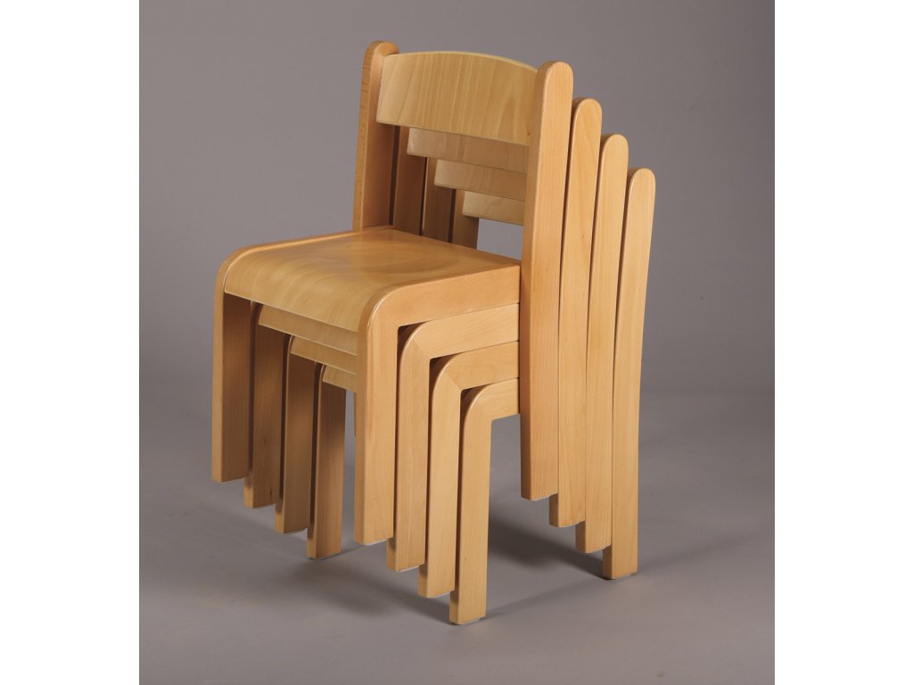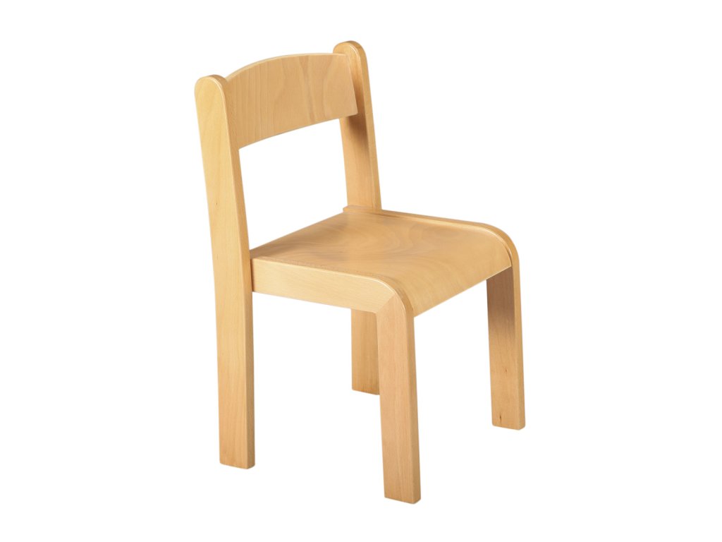 židle pro mateřské školky (jesle) s konstrukcí z lakovaného bukového dřeva, překližkový sedák a opěradlo, v přírodní barvě, stohovatelná.