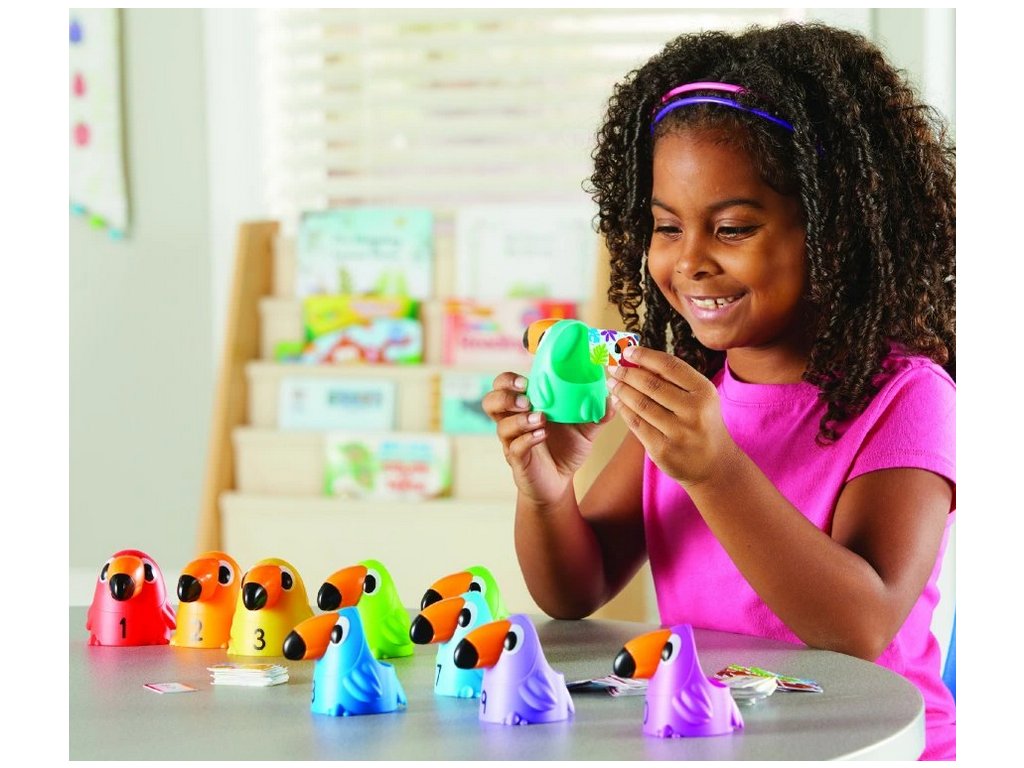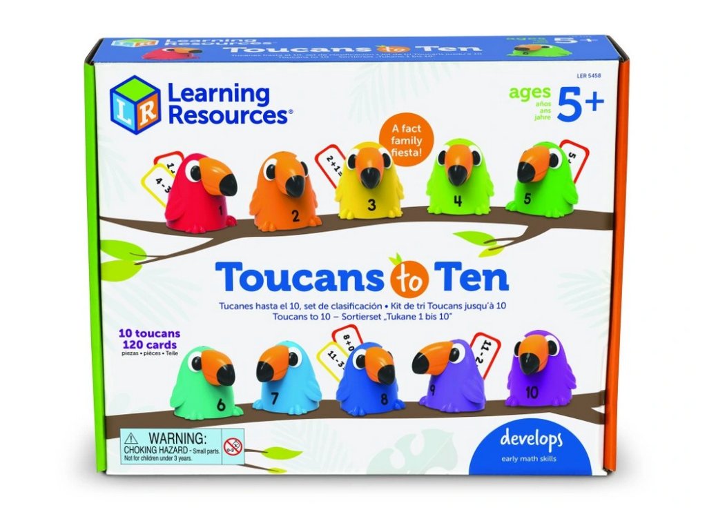 Learning Resources Toucans to 10 je interaktivní matematická sada, která promění výuku sčítání a odčítání v barevnou a zábavnou hru. Set obsahuje deset středně velkých tukaních figurek číslovaných od 1 do 10, každá v živé barvě, a k nim 120 karet s rovnicemi (addice a subtrahce).