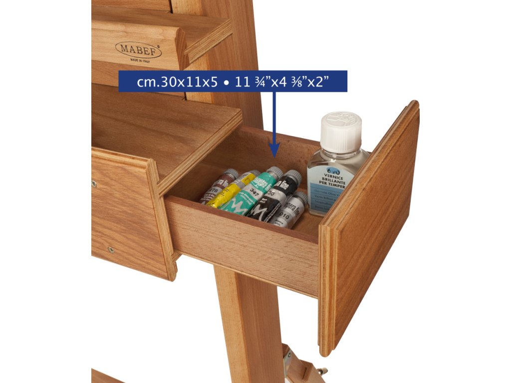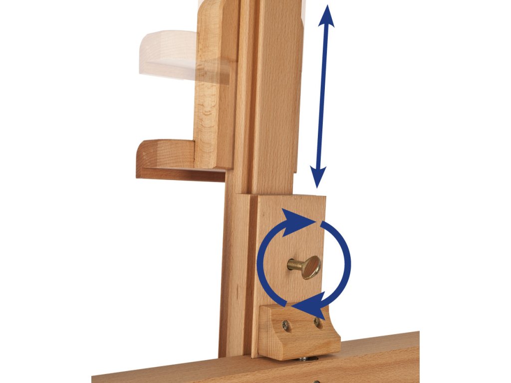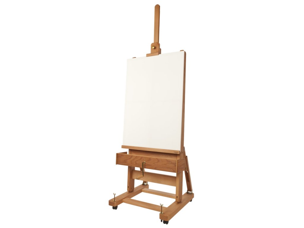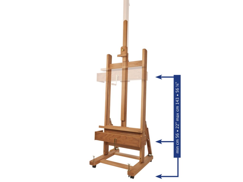 Extra velký stojan typu H pro umístění pláten až do výšky 235cm. Zajišťuje vysokou stabilitu a komfort. Polohovatelnost plátna pomocí kliky. Stojan má kolečka pro snadné přemístění - je ho však možné "zabrzdit" pomocí výsuvných šroubů na přední části stojanu. Velký prostor pro ukládání barev, štětců a pomůcek na spodní lištu i přímo do ní.