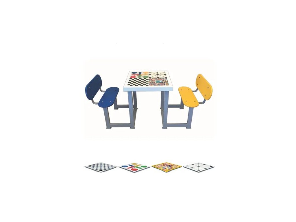 Herní stůl MMCCG4 má 4 lavice z pozinkované oceli a kompaktní digitálně potištěnou desku / sklolaminátovou desku pro hraní šachů, parcheesi, husy a piškvorek. Na herní plán lze zahrnout jakýkoli typ hry, buď společně nebo jednotlivě.