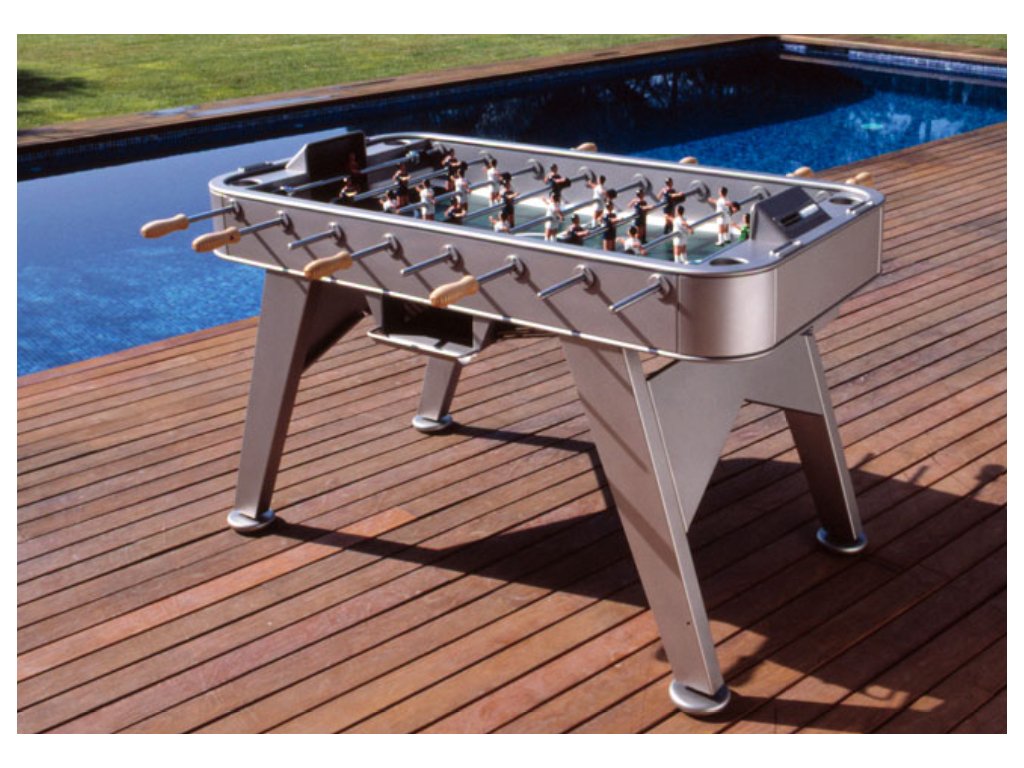 Fotbalový stůl s elegantním avantgardním designem, odolný vůči nepřízni počasí a vyžadující minimální údržbu.