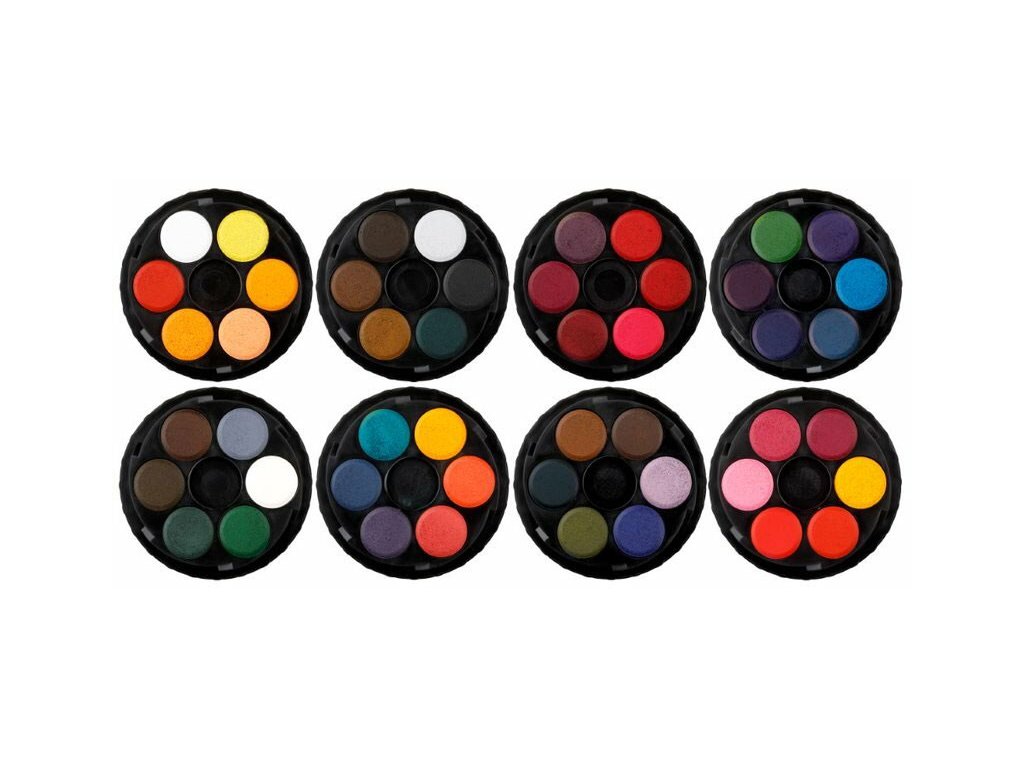 Vodové barvy Koh-i-noor o průměru tablet 22,5 mm s 48 brilantními odstíny vhodné pro speciální výtvarné techniky, např. pro kolorování fotografií, malby portrétů, malby na dekorační předměty, zdobení kraslic aj.