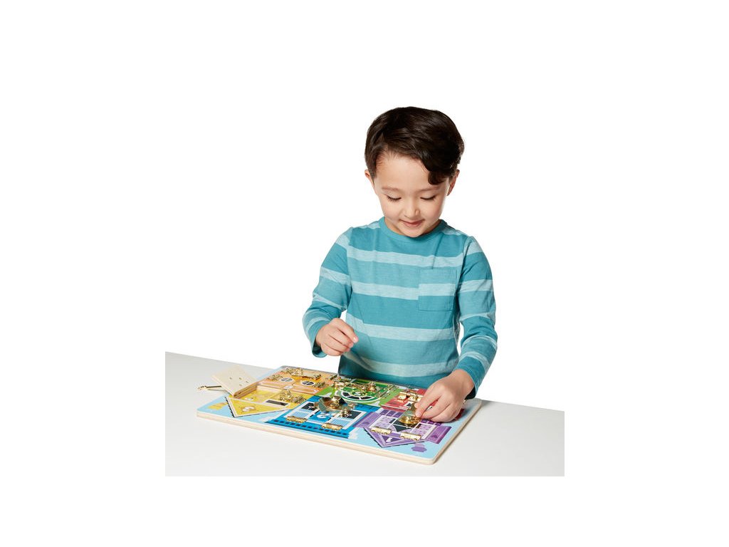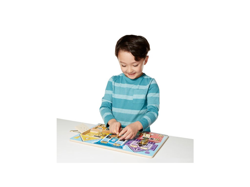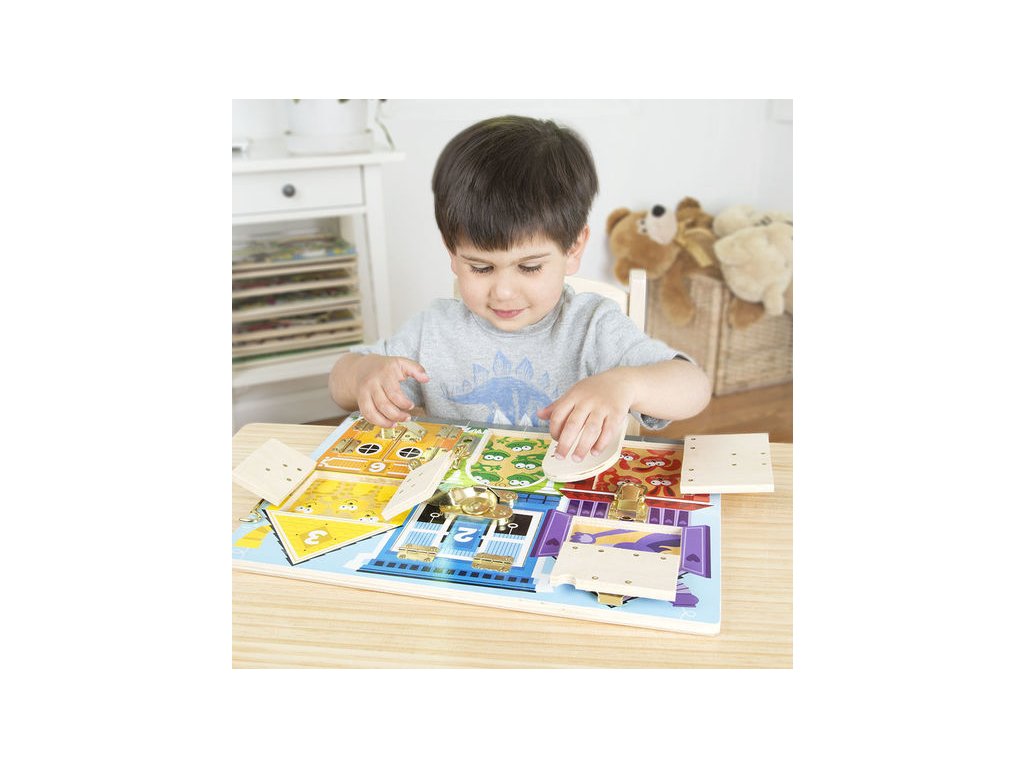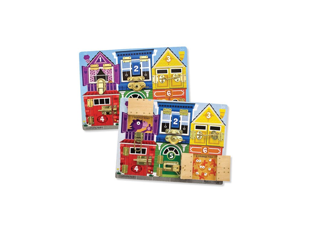Oddělejte zámek a otevřete očíslované dveře či okénko. Za každými dveřmi je schovaný veselý obrázek zvířátek. Rozvíjí jemnou motoriku a zároveň se děti učí poznávat barvy, druhy zvířátek a počítat.