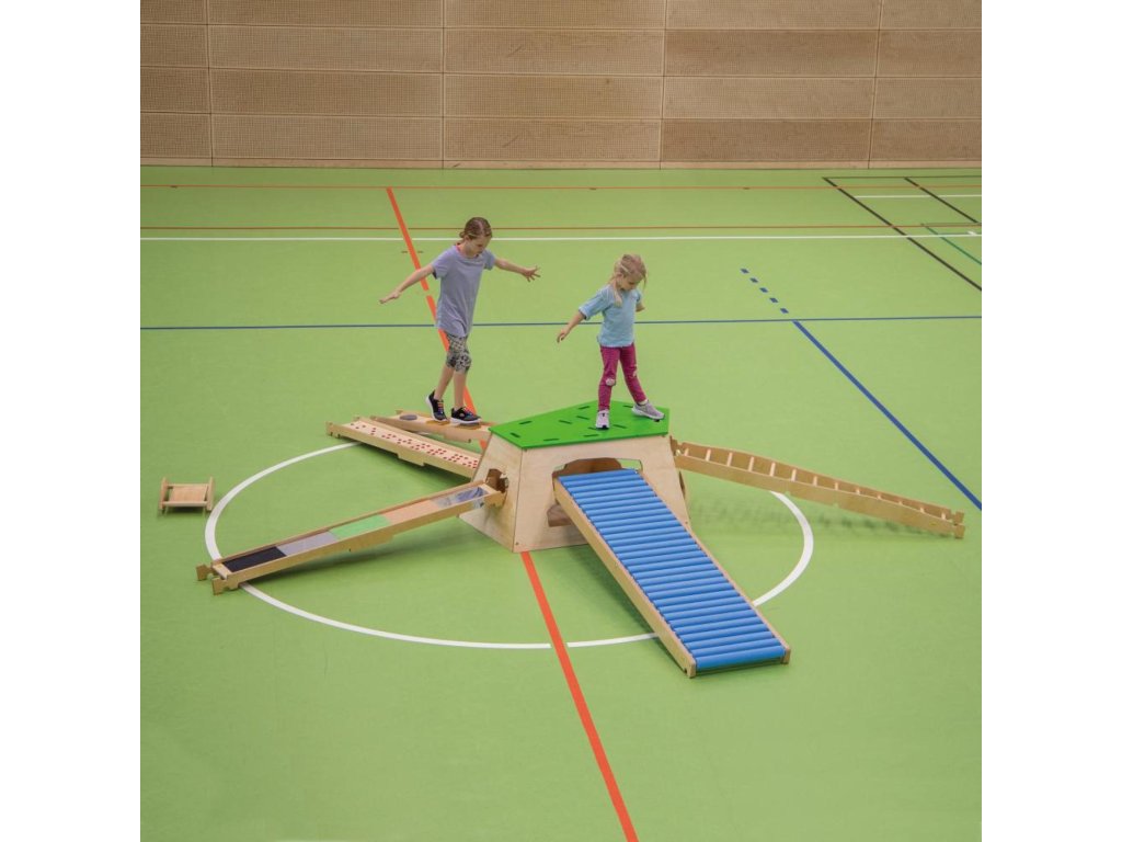 Sportovní bedna Základna tvoří základní modul pro spoustu rozmanitých balančních a fitness tras. S balančními lavičkami a válečkovými klouzačkami Erzi lze vytvořit nespočet kombinací. Dvě víka slouží jako pojízdné desky. Do boxu se vejde až pět balančních laviček pro přepravu a skladování. Základnu můžete přepravovat pomocí kolečkových desek.