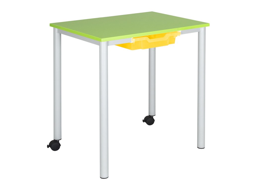 Flexi jednomístný, s jednou zásuvkou, žákovský stůl na kolečkách, vysoce odolná deska stolu z překližky o tl. 16 mm, která je oboustranně potažena dekoritem, hrany jsou ošetřeny lněným olejem, provedení s ostrými rohy. plastové zásuvky Gratnell's v různých barvách, na výběr mezi pevnými nohami nebo 2 nohami zakončenými kolečky.