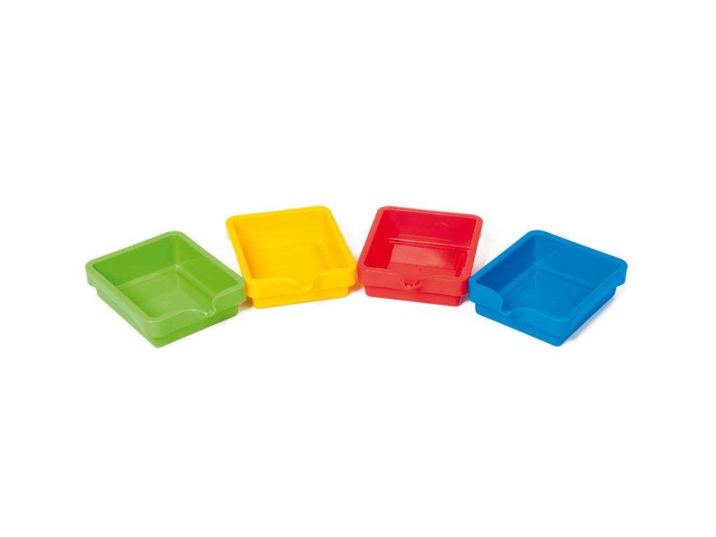 - Plastové tácky vybavené nálevkou usnadňující nalévání barev nebo jiných tekutin