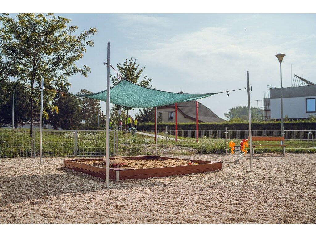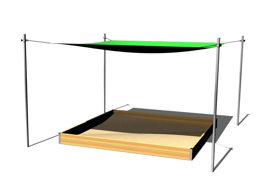 Nosná konstrukce zastínění pískoviště je vyrobena z konstrukční oceli, která je proti korozi chráněna žárovým zinkováním, čímž se docílí velmi výrazného prodloužení životnosti herního prvku. Tato konstrukce je uložena do betonového lože. Zastínění pískoviště je vyrobeno z tzv. rašlu (vysoce kvalitní, pevná a odolná stínící tkanina). Zastínění pískoviště je vodě propustné. Všechen spojovací materiál je pozinkovaný nebo nerezový.