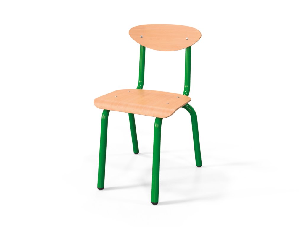 židle s kovovou konstrukcí určená pro mateřské školky a jesle, ocelová trubková konstrukce o průměru 25 mm je opatřena elektrostaticky nanášenou práškovou barvou, lakovaný tvarovaný překližkový sedák a opěradlo, nohy jsou zakončeny plastovými koncovkami, stohovatelná.